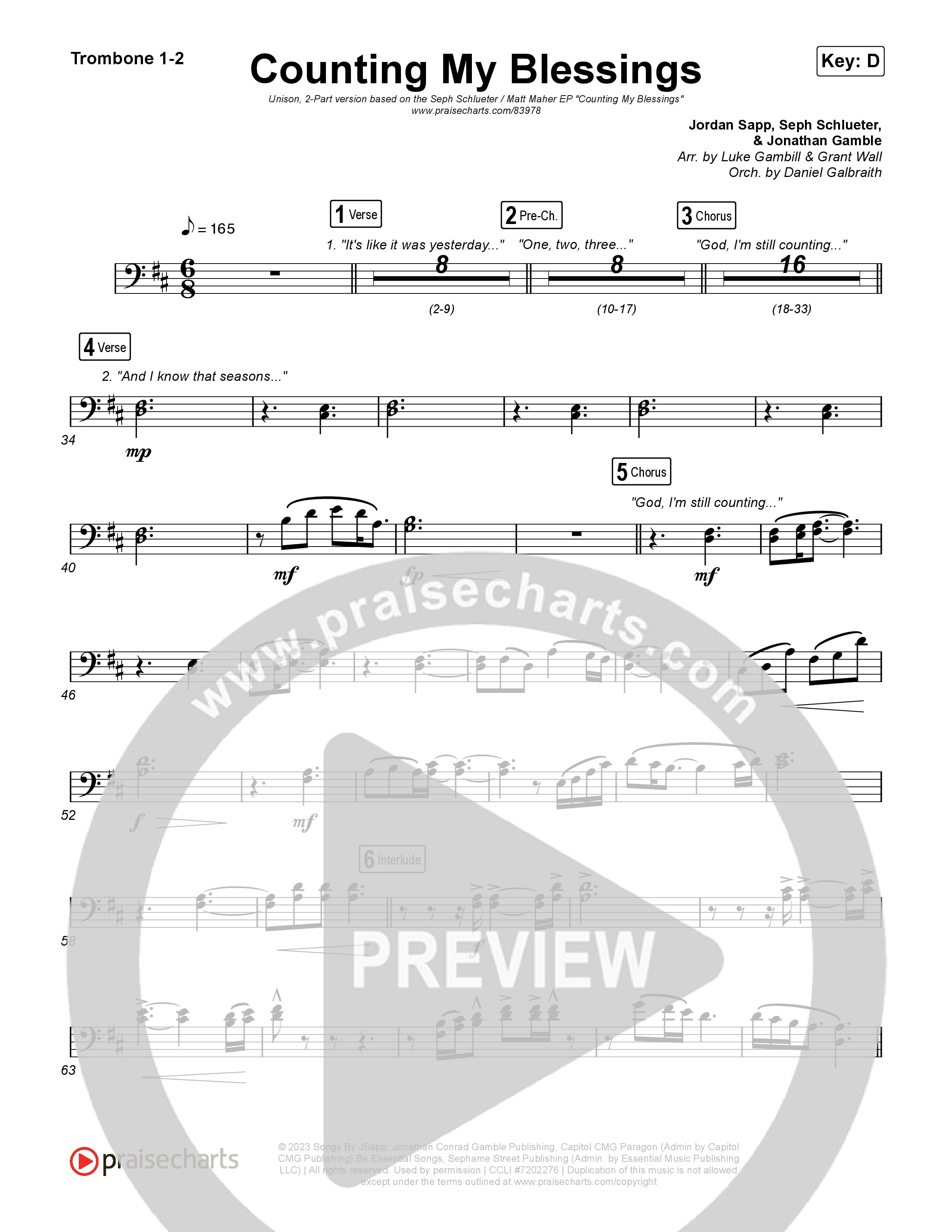 Download the Trombone 1,2 sheet music for Counting My Blessings (Unison/2-Part) by Seph Schlueter / Matt Maher, from the album Counting My Blessings EP. This song was arranged by Grant Wall / Daniel Galbraith in the key of D.