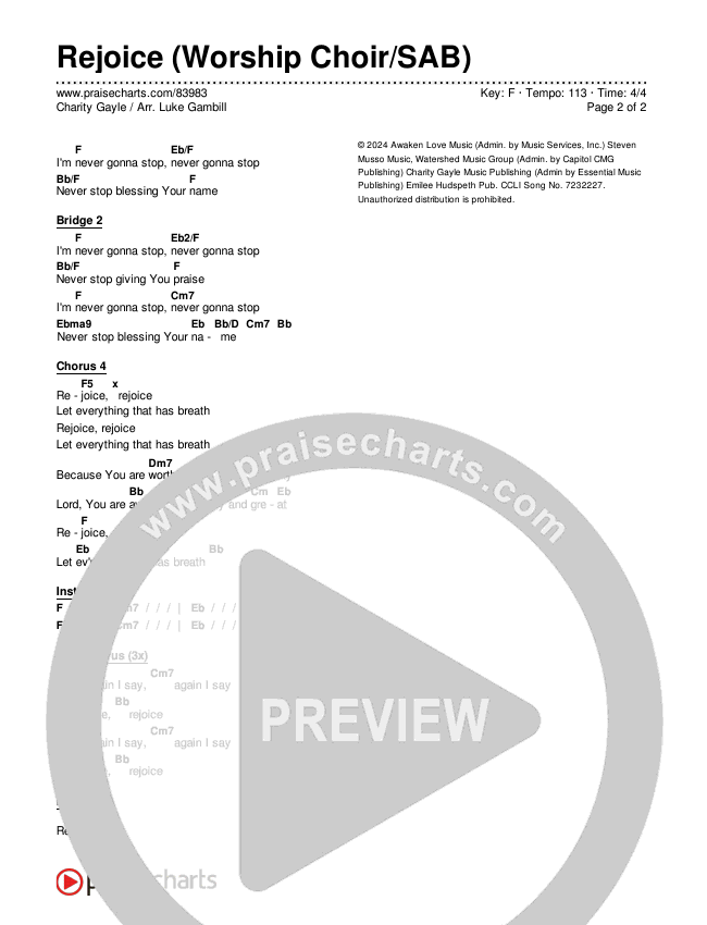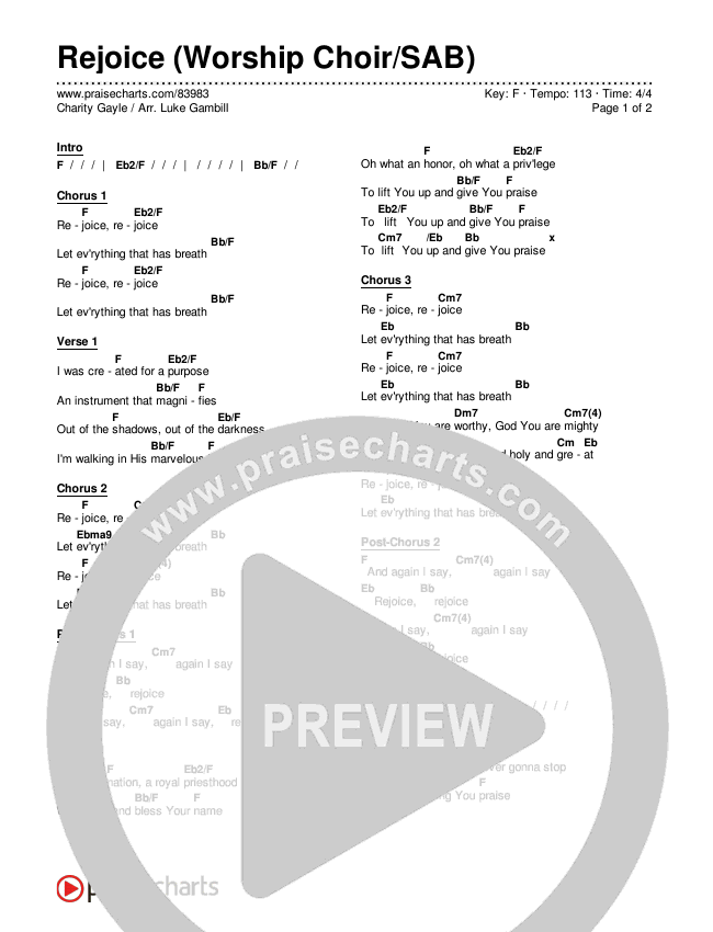 Download the PDF Chord Charts for Rejoice (Worship Choir/SAB) by Charity Gayle / Arr. Luke Gambill, from the album Rejoice. This song was arranged by Daniel Galbraith / Luke Gambill in the key of F.
