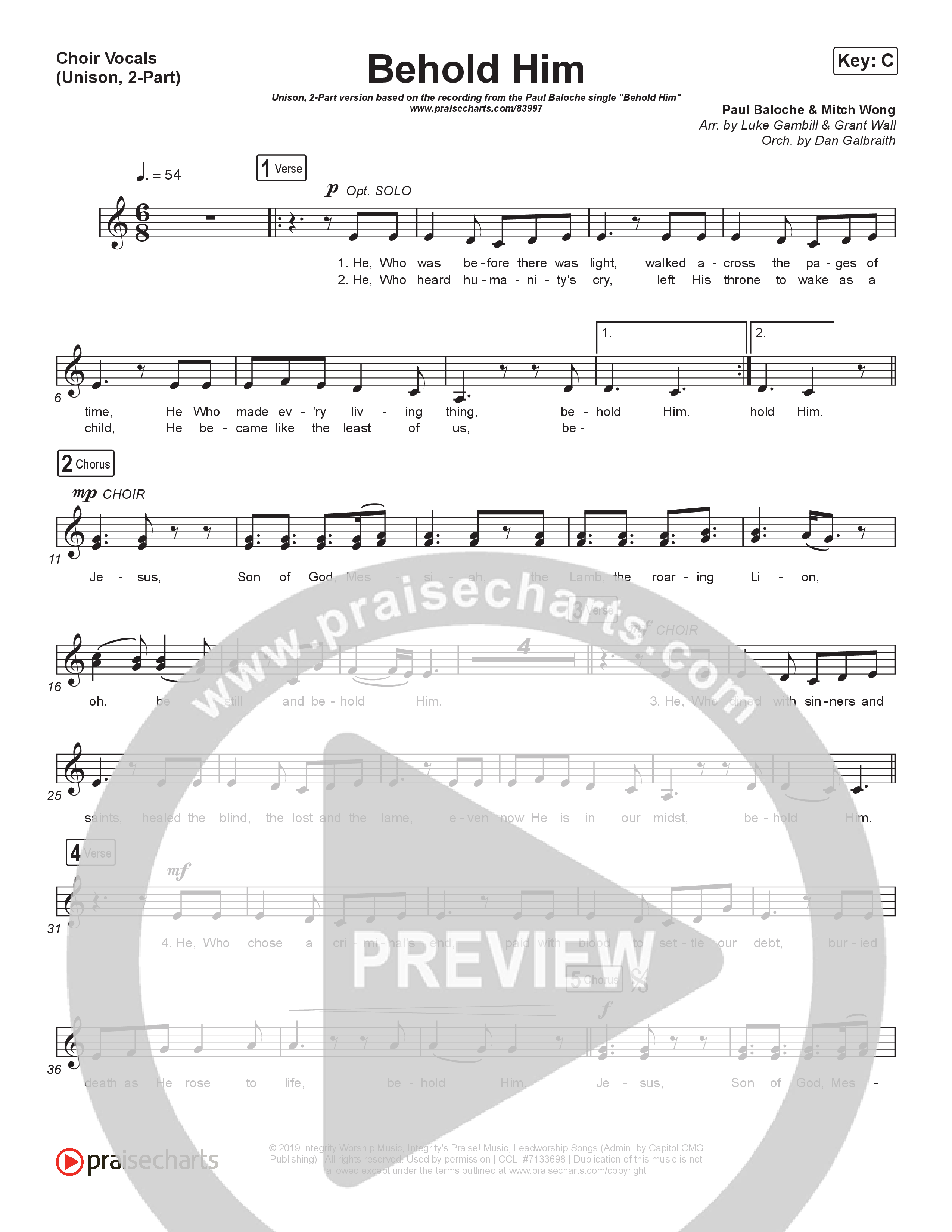 Download the PDF sheet music for Behold Him (Unison/2-Part) by Paul Baloche / Kim Walker-Smith / Arr. Luke Gambill, from the album Behold Him. This song was arranged by Grant Wall / Daniel Galbraith / Luke Gambill in the key of C.