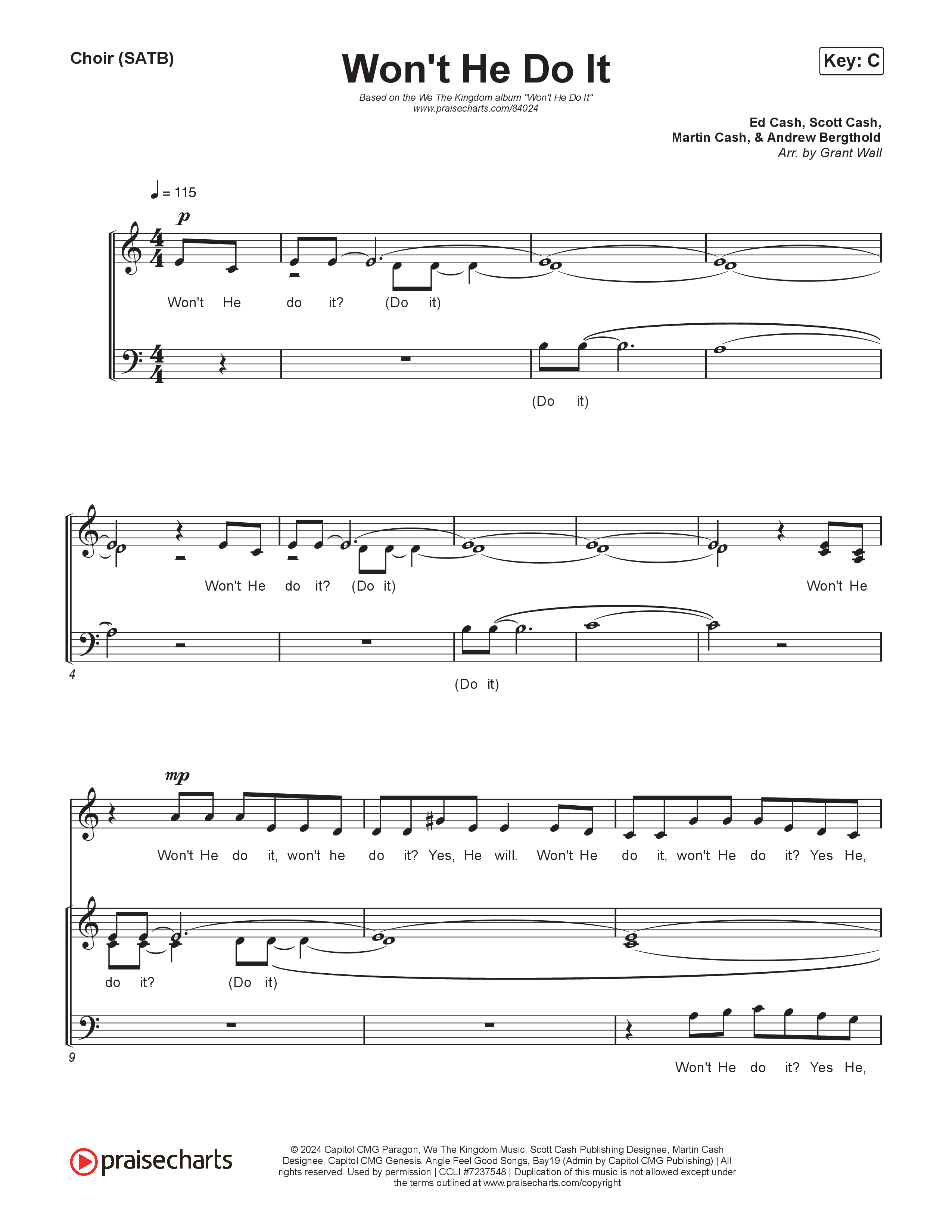 Download the Choir Sheet for Won't He Do It by We The Kingdom, from the album Won't He Do It. This song was arranged by Grant Wall in the key of Bb, C.