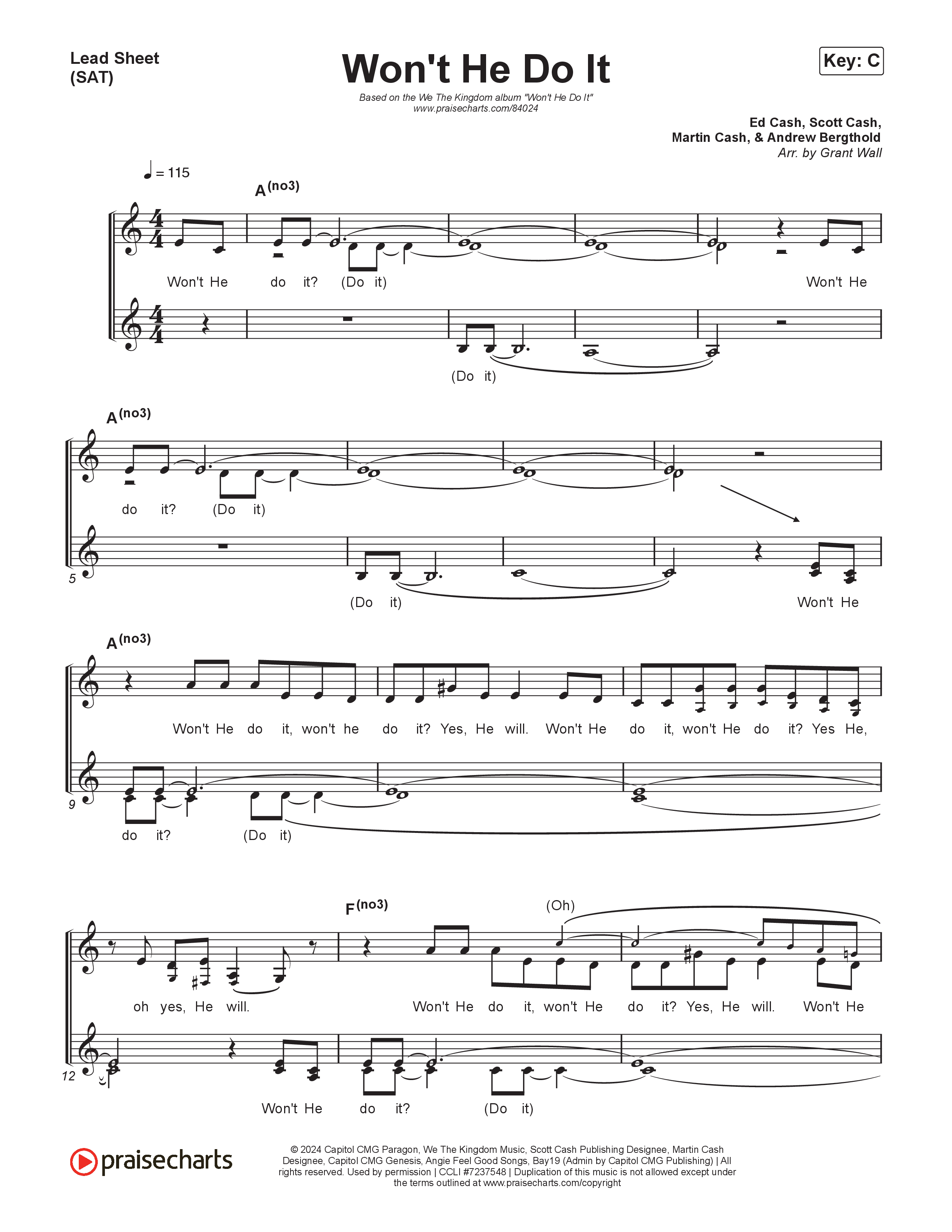 Download the sheet music for Won't He Do It by We The Kingdom, from the album Won't He Do It. This song was arranged by Grant Wall in the key of Bb, C.