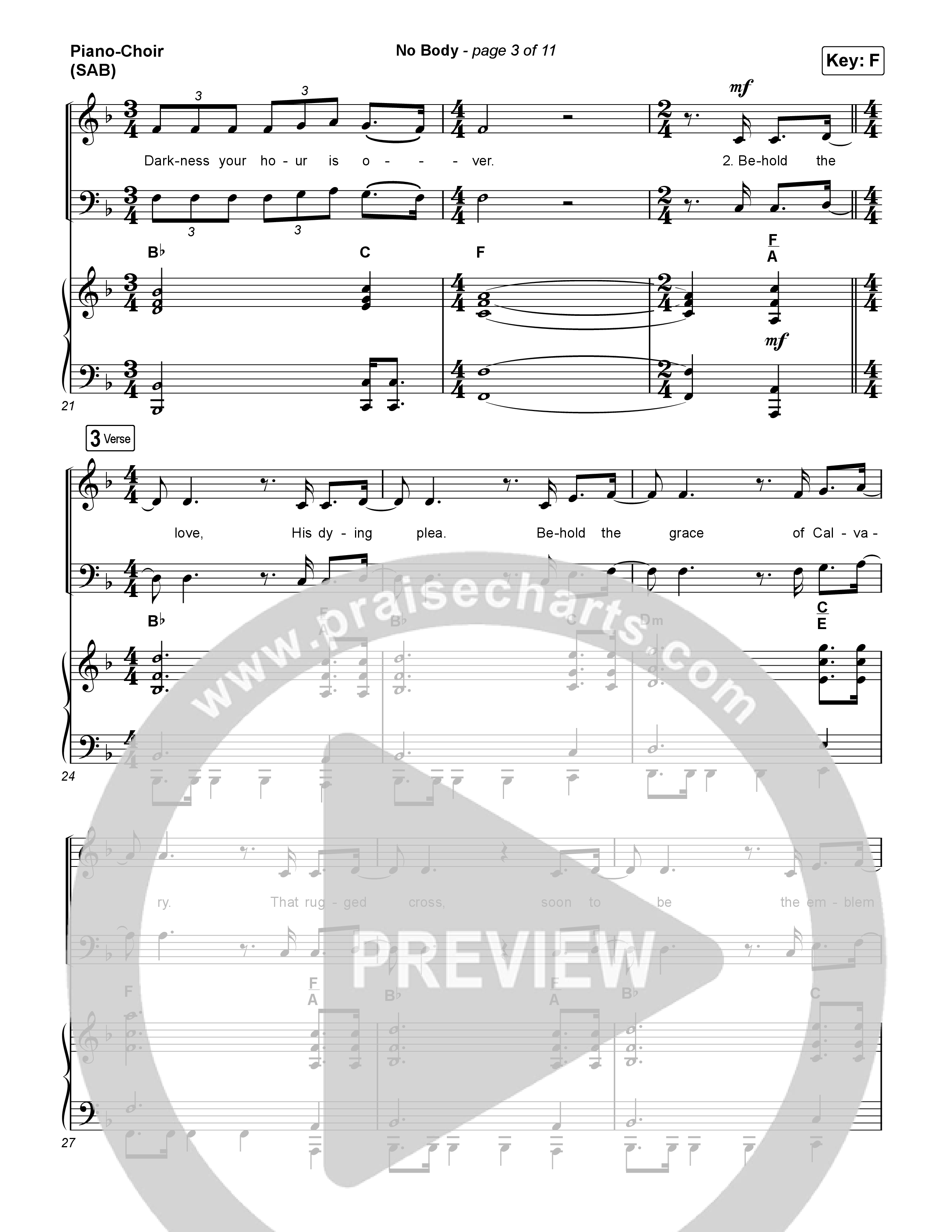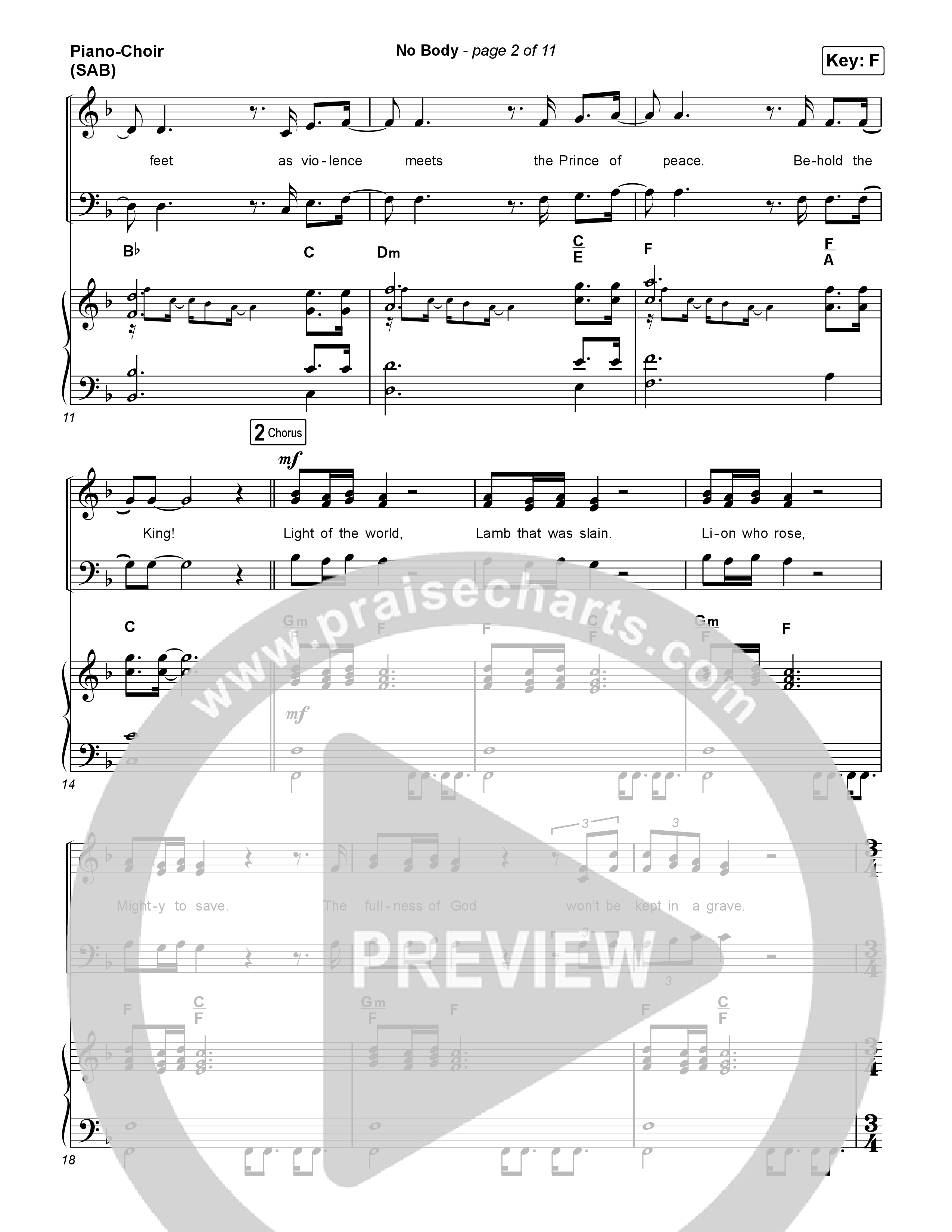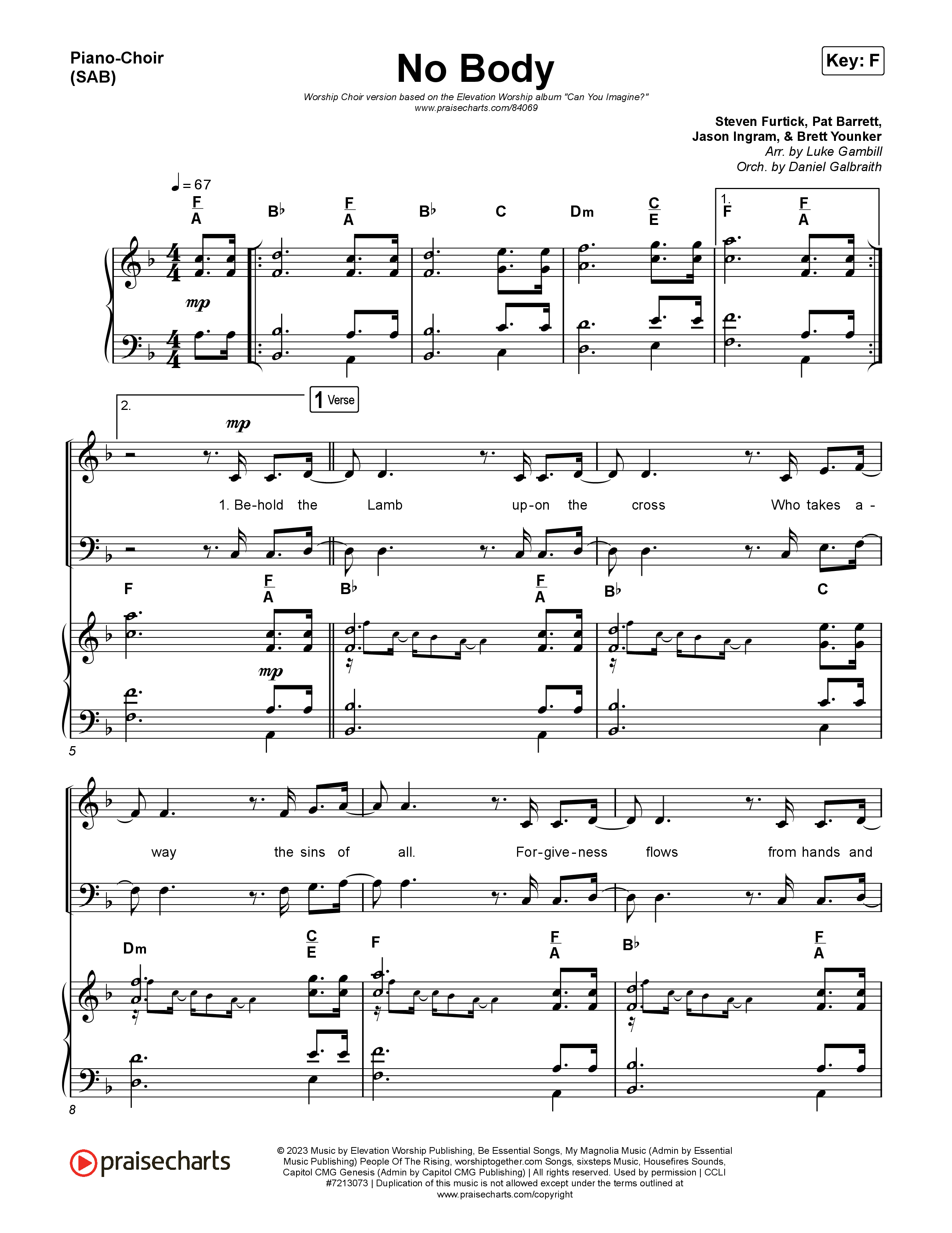 Download the PDF sheet music for No Body (Worship Choir/SAB) by Elevation Worship / Jonsal Barrientes / Arr. Luke Gambill, from the album Can You Imagine?. This song was arranged by Daniel Galbraith / Luke Gambill in the key of F.