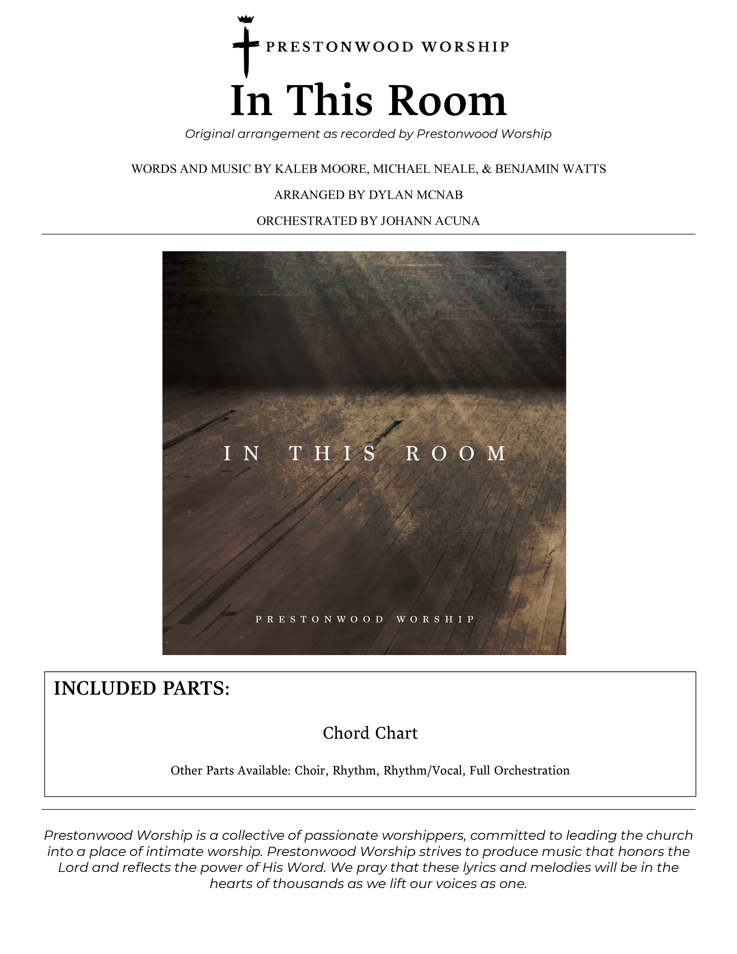Download the PDF Chord Charts for In This Room by Prestonwood Worship / Arr. Dylan McNab / Orch. Johann Acuna, from the album In This Room (Single). This song was arranged by Dylan McNab / Johann Acuna in the key of C.