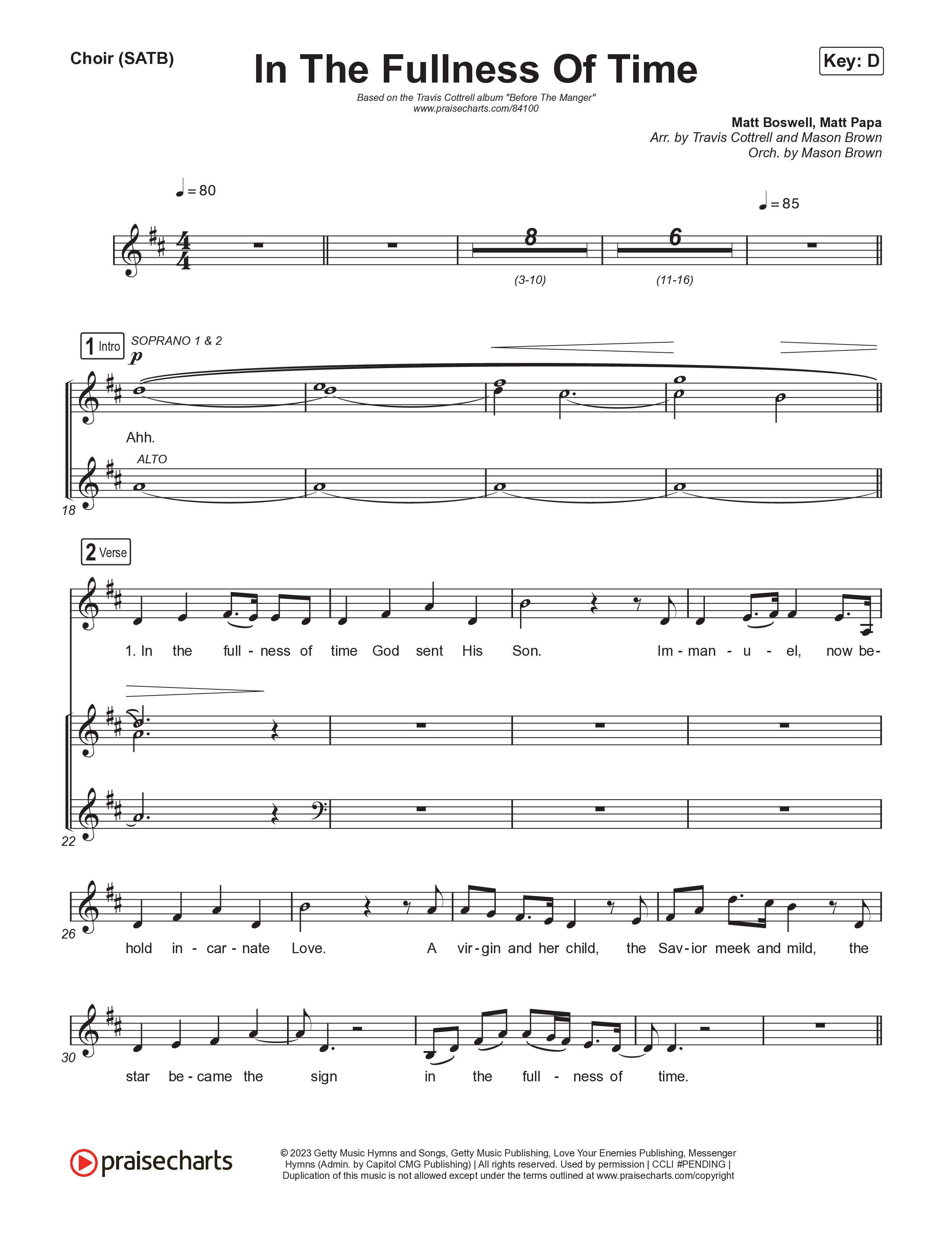 Download the PDF sheet music for In The Fullness Of Time (Choral/SATB) by Travis Cottrell / Arr. Mason Brown, from the album Before The Manger. This song was arranged by Travis Cottrell / Mason Brown in the key of D.