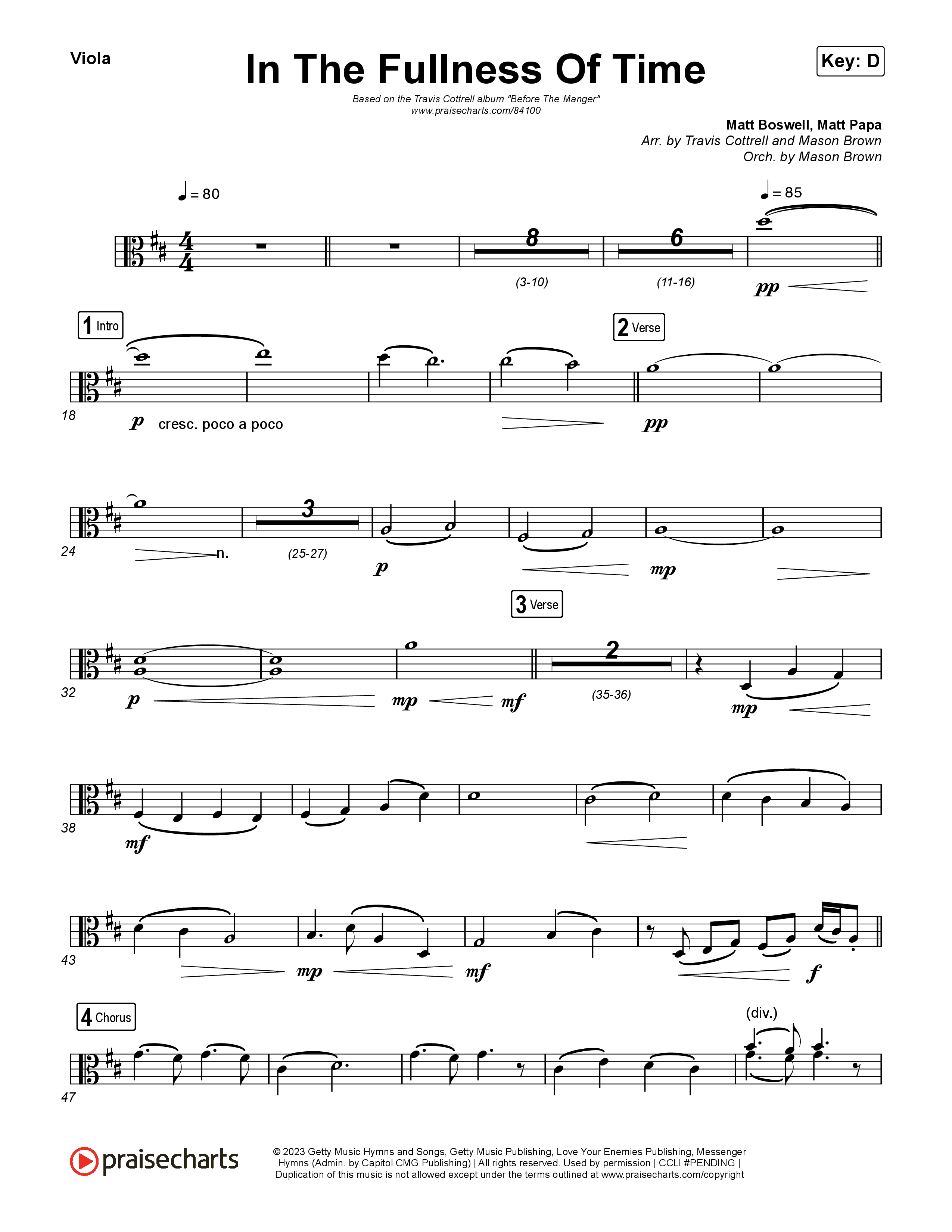 Download the Viola sheet music for In The Fullness Of Time (Choral/SATB) by Travis Cottrell / Arr. Mason Brown, from the album Before The Manger. This song was arranged by Travis Cottrell / Mason Brown in the key of D.