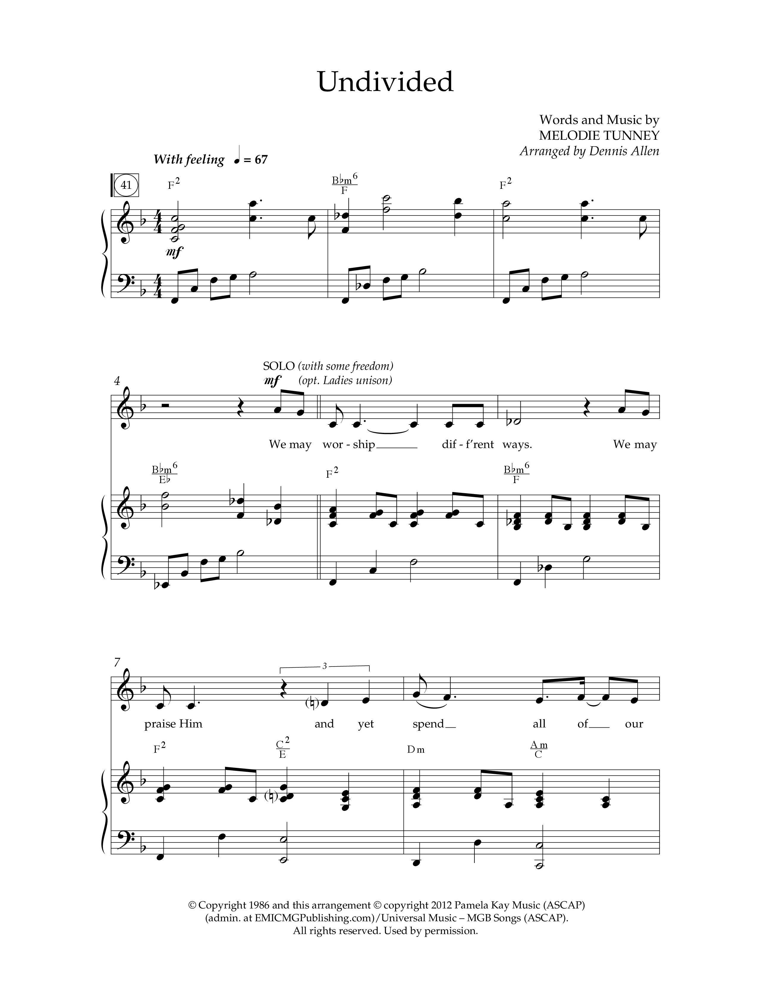 Download the PDF sheet music for Undivided (Choral Anthem SATB) by Lifeway Choral / Arr. Dennis Allen, from the album Non-Seasonal Choral Anthems. This song was arranged by Dennis Allen in the key of F.