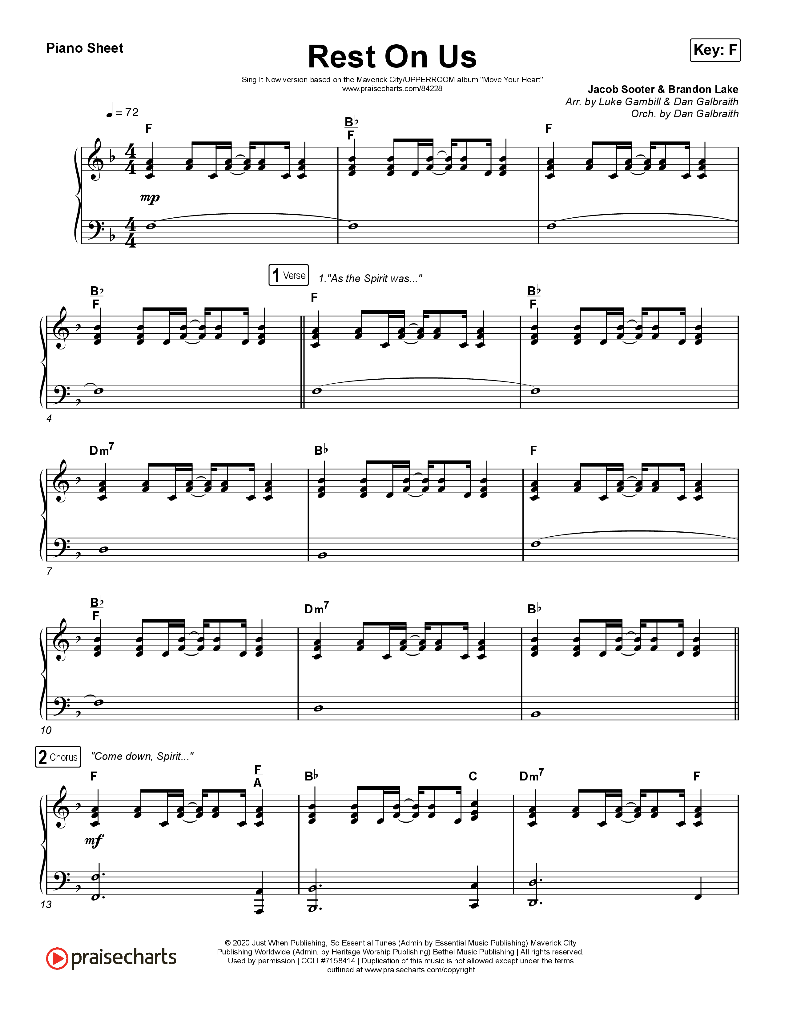 Download the piano sheet for Rest On Us (Sing It Now) by Maverick City Music / UPPERROOM / Brandon Lake / Eniola Abioye / Arr. Luke Gambill, from the album Move Your Heart EP. This song was arranged by Daniel Galbraith / Luke Gambill in the key of F.
