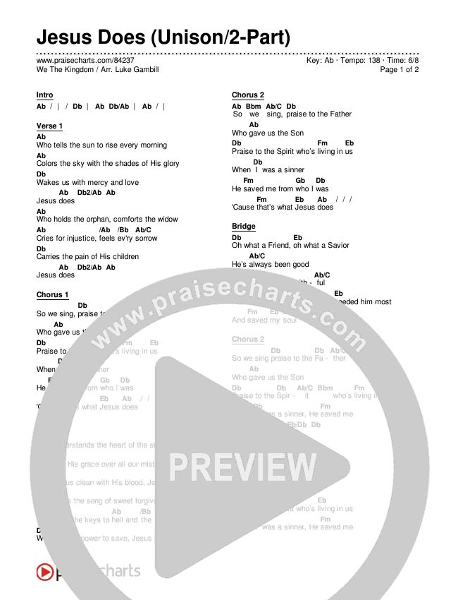 Download the PDF Chord Charts for Jesus Does (Unison/2-Part) by We The Kingdom / Arr. Luke Gambill, from the album We The Kingdom. This song was arranged by Daniel Galbraith / Luke Gambill in the key of Ab.