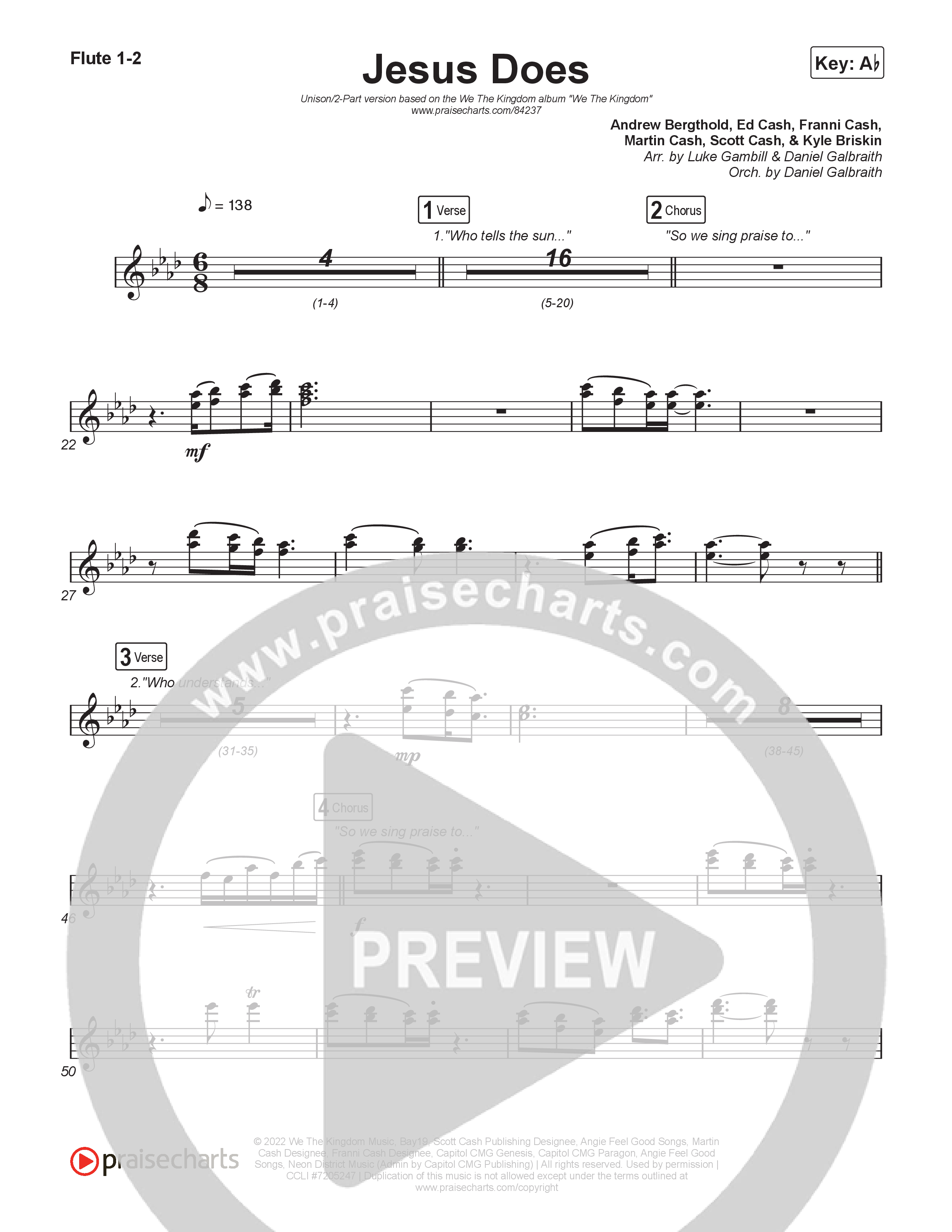 Download the Flute sheet music for Jesus Does (Unison/2-Part) by We The Kingdom / Arr. Luke Gambill, from the album We The Kingdom. This song was arranged by Daniel Galbraith / Luke Gambill in the key of Ab.