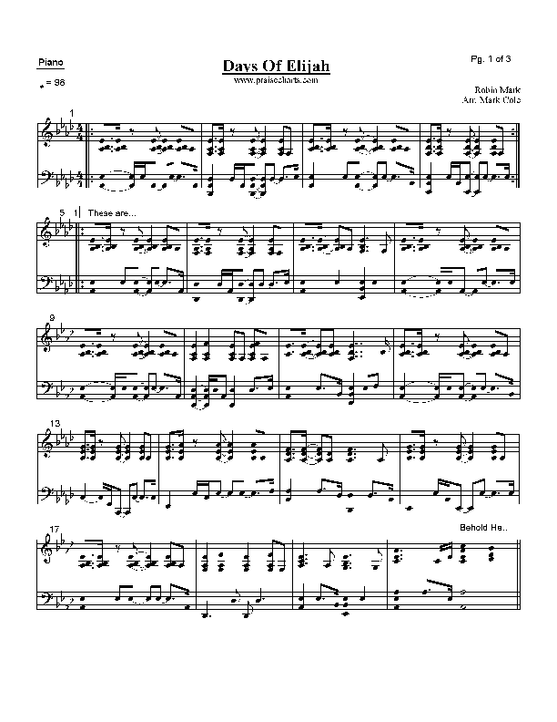 Download the Orchestration for Days of Elijah by Robin Mark, from the album Revival In Belfast. This song was arranged by Mark Cole in the key of Ab, G.