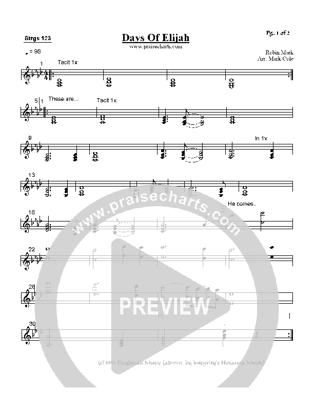 Download the Orchestration for Days of Elijah by Robin Mark, from the album Revival In Belfast. This song was arranged by Mark Cole in the key of Ab, G.