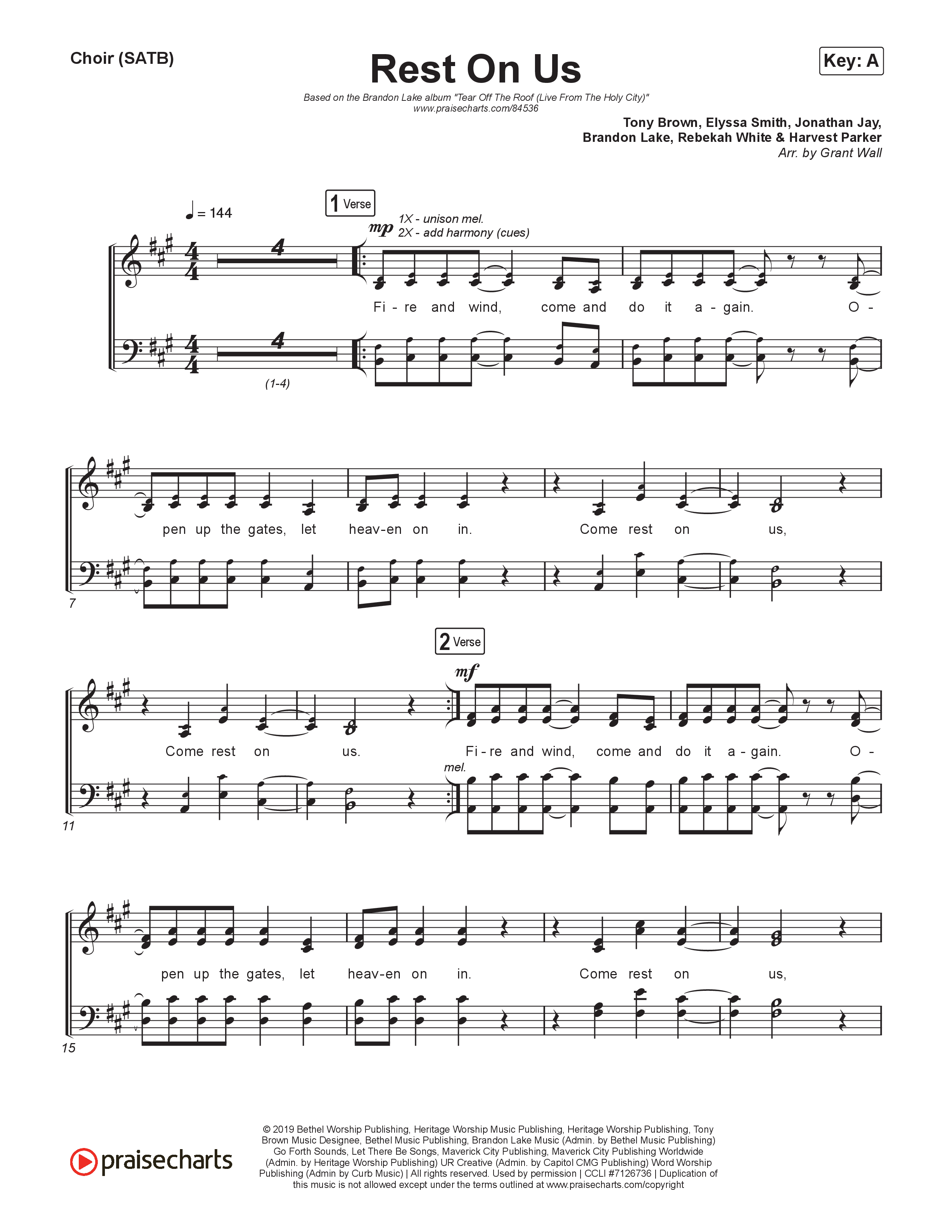 Download the Choir Sheet for Rest On Us (Live) by Brandon Lake, from the album Tear Off The Roof (Live From The Holy City). This song was arranged by Grant Wall in the key of A, Ab.
