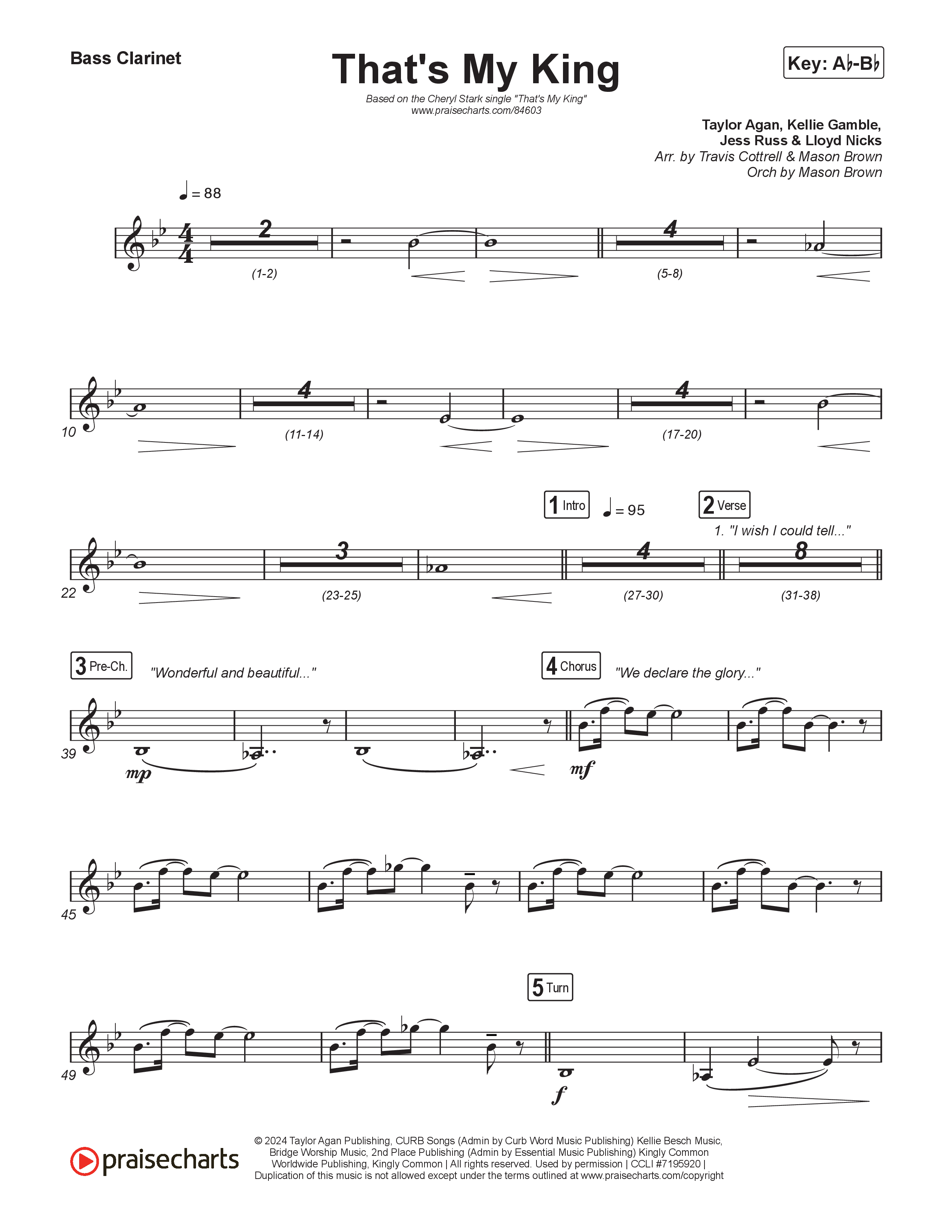 Download the Bass Clarinet sheet music for That's My King (Choral/SATB) by Cheryl Stark / Arr. Travis Cottrell / Orch. Mason Brown, from the album Redemption Story. This song was arranged by Travis Cottrell / Mason Brown in the key of Ab.