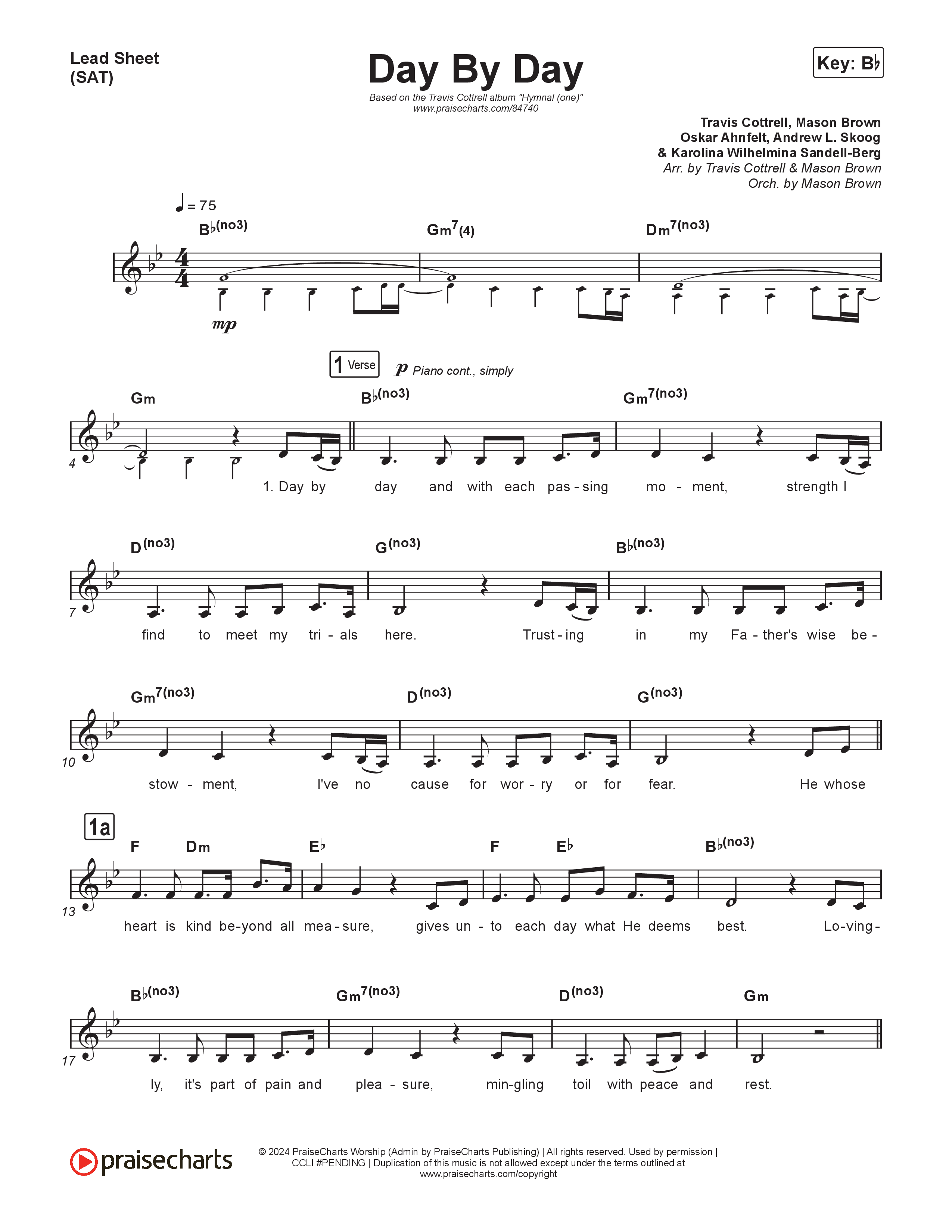 Download the sheet music for Day By Day (Choral/SATB) by Travis Cottrell / Lily Cottrell / Arr. Mason Brown, from the album Hymnal (one). This song was arranged by Travis Cottrell / Mason Brown in the key of Bb.