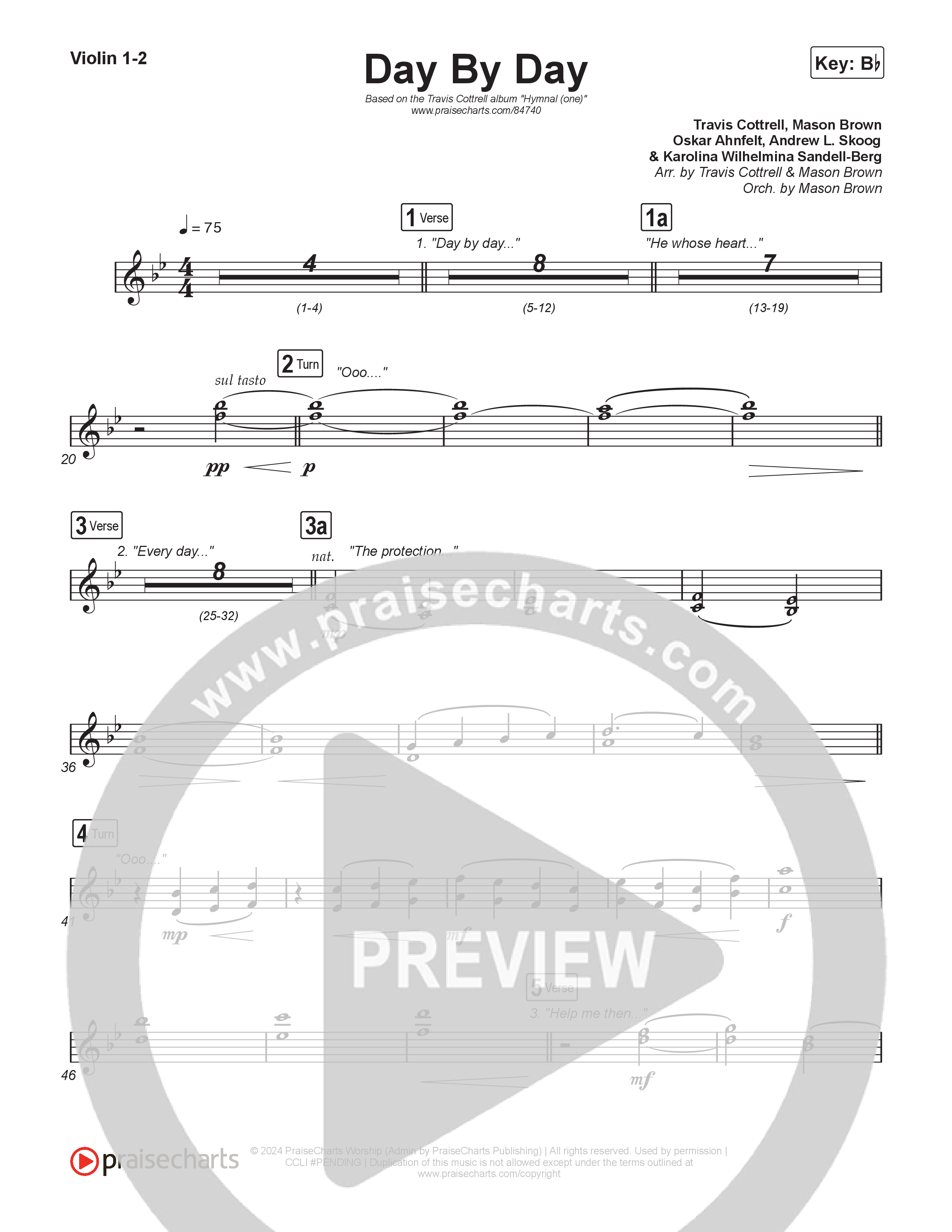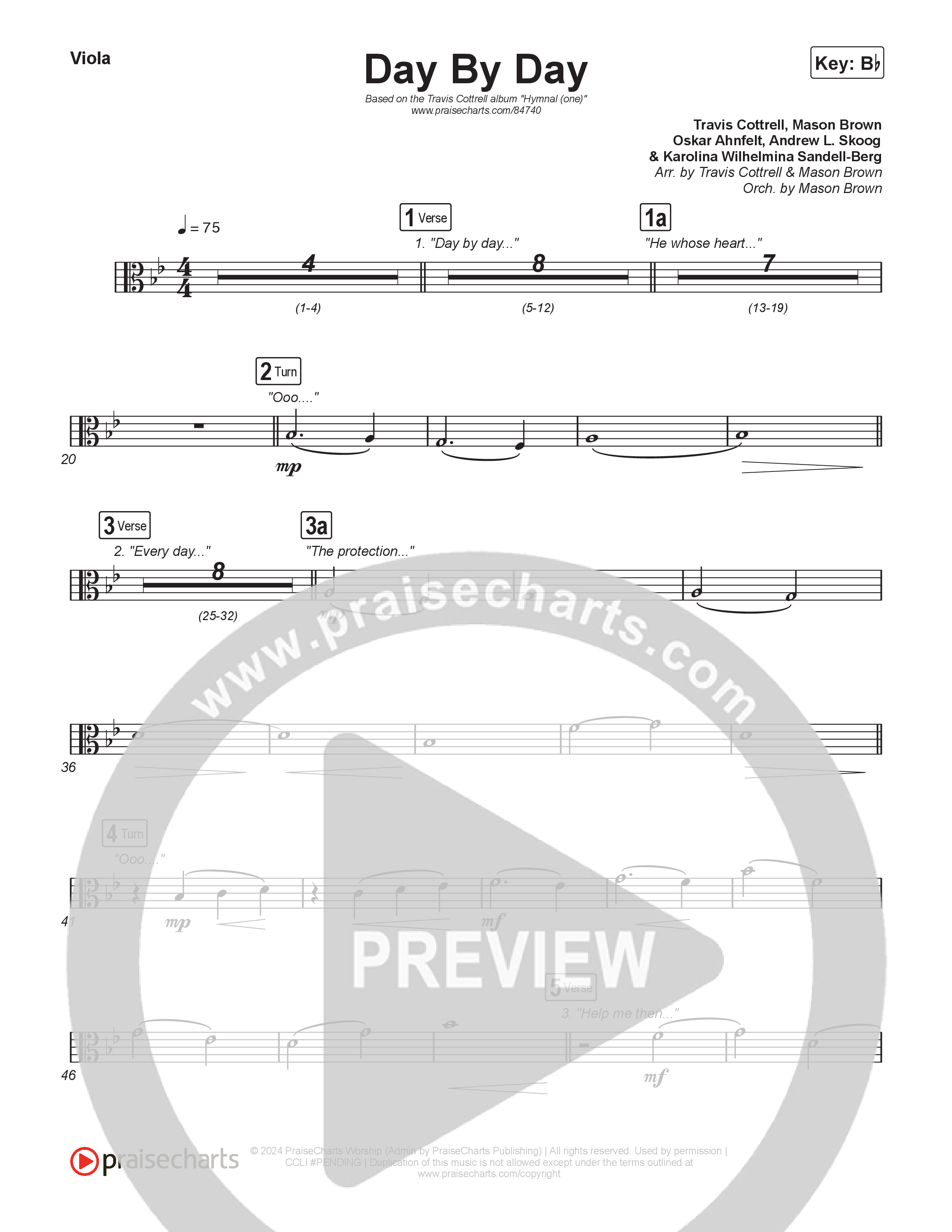 Download the Orchestration string parts for Day By Day (Choral/SATB) by Travis Cottrell / Lily Cottrell / Arr. Mason Brown, from the album Hymnal (one). This song was arranged by Travis Cottrell / Mason Brown in the key of Bb.