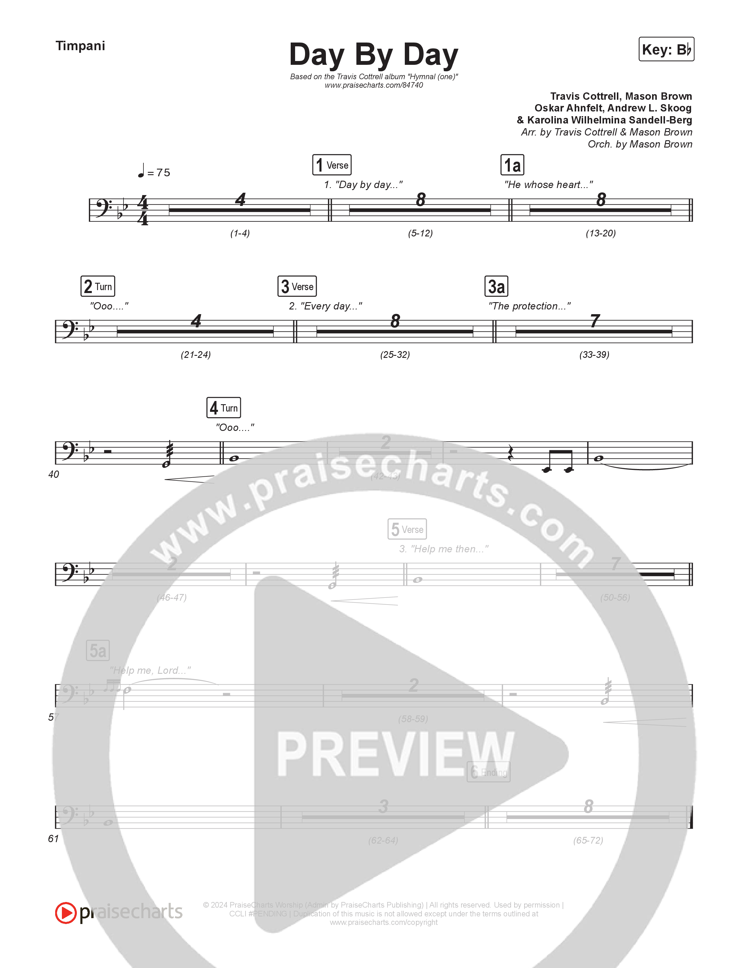 Download the Timpani sheet music for Day By Day (Choral/SATB) by Travis Cottrell / Lily Cottrell / Arr. Mason Brown, from the album Hymnal (one). This song was arranged by Travis Cottrell / Mason Brown in the key of Bb.