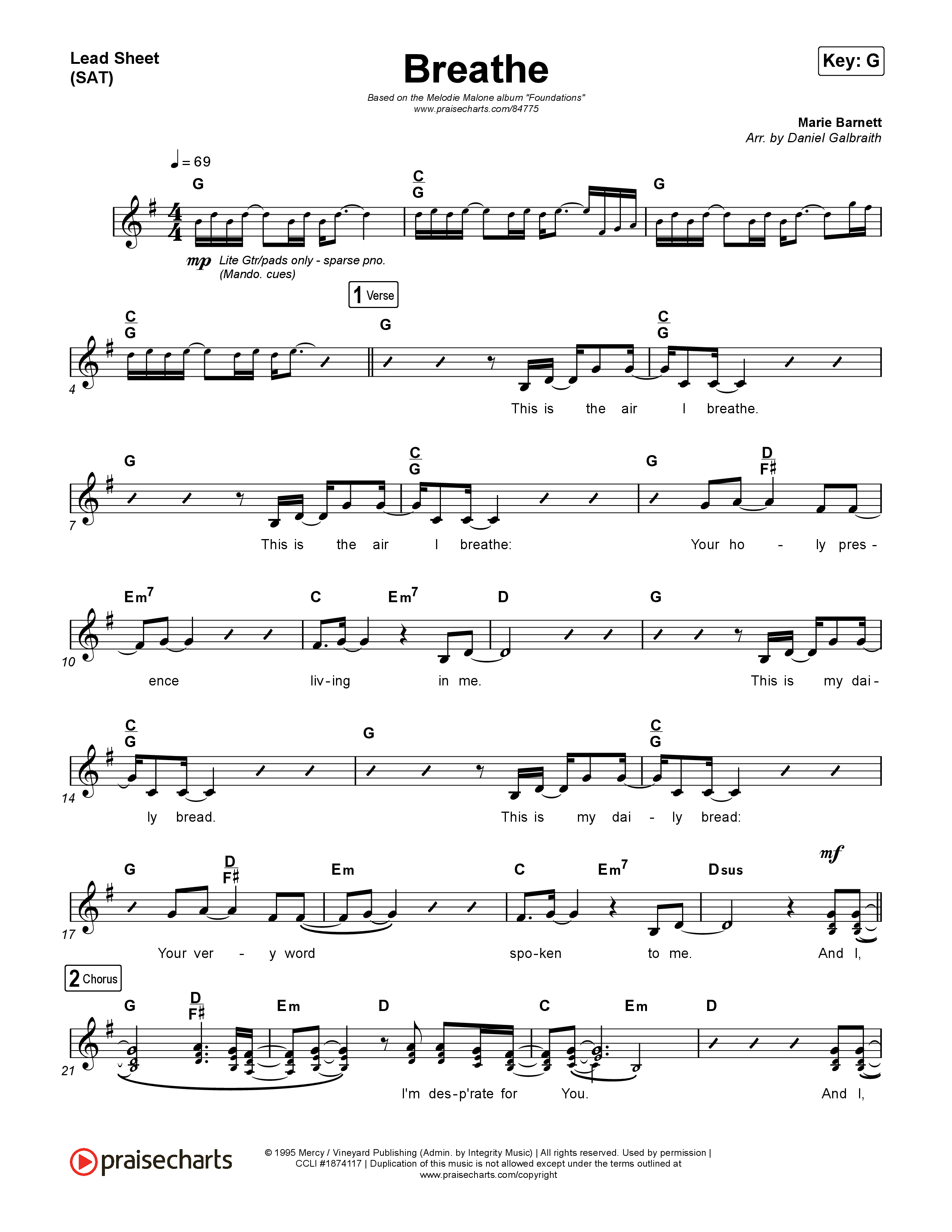 Download the sheet music for Breathe (Live) by Worship Circle / Melodie Malone, from the album Foundations. This song was arranged by Daniel Galbraith in the key of Ab, G.