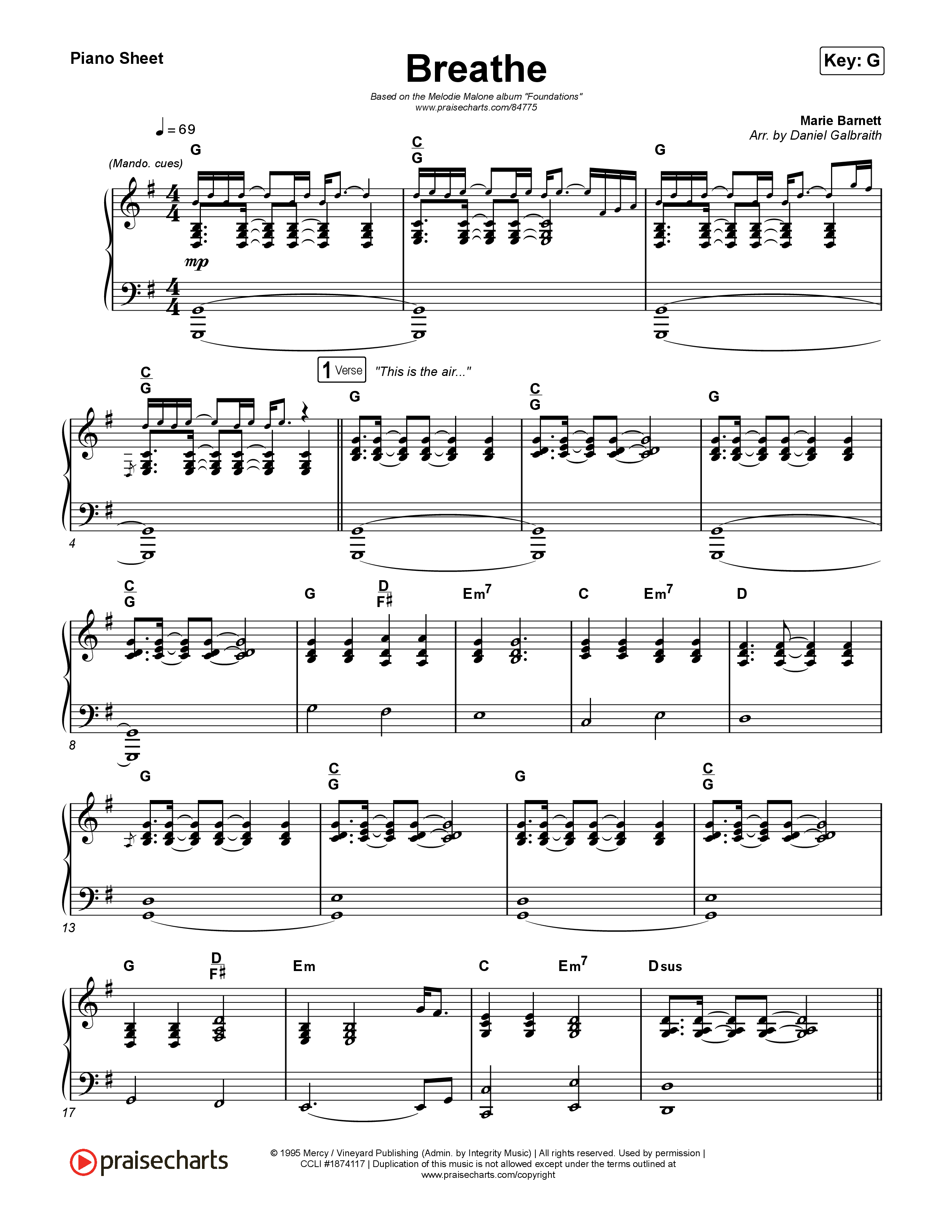 Download the piano sheet for Breathe (Live) by Worship Circle / Melodie Malone, from the album Foundations. This song was arranged by Daniel Galbraith in the key of Ab, G.