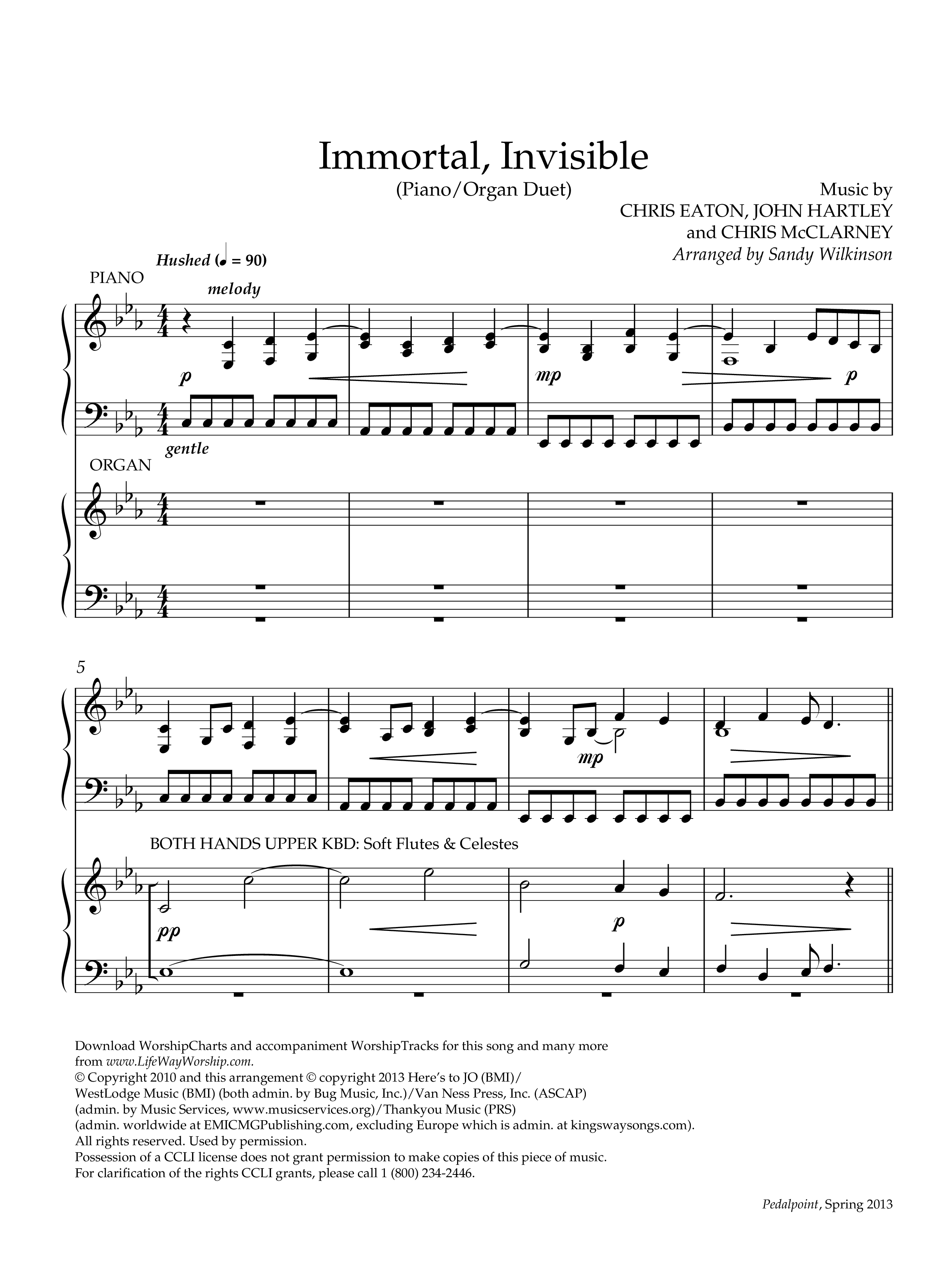 Download the Orchestration for Immortal Invisible (Instrumental) by Lifeway Worship / Arr. Sandy Wilkinson, from the album PedalPoint Spring 2013. This song was arranged by Sandy Wilkinson in the key of Eb.