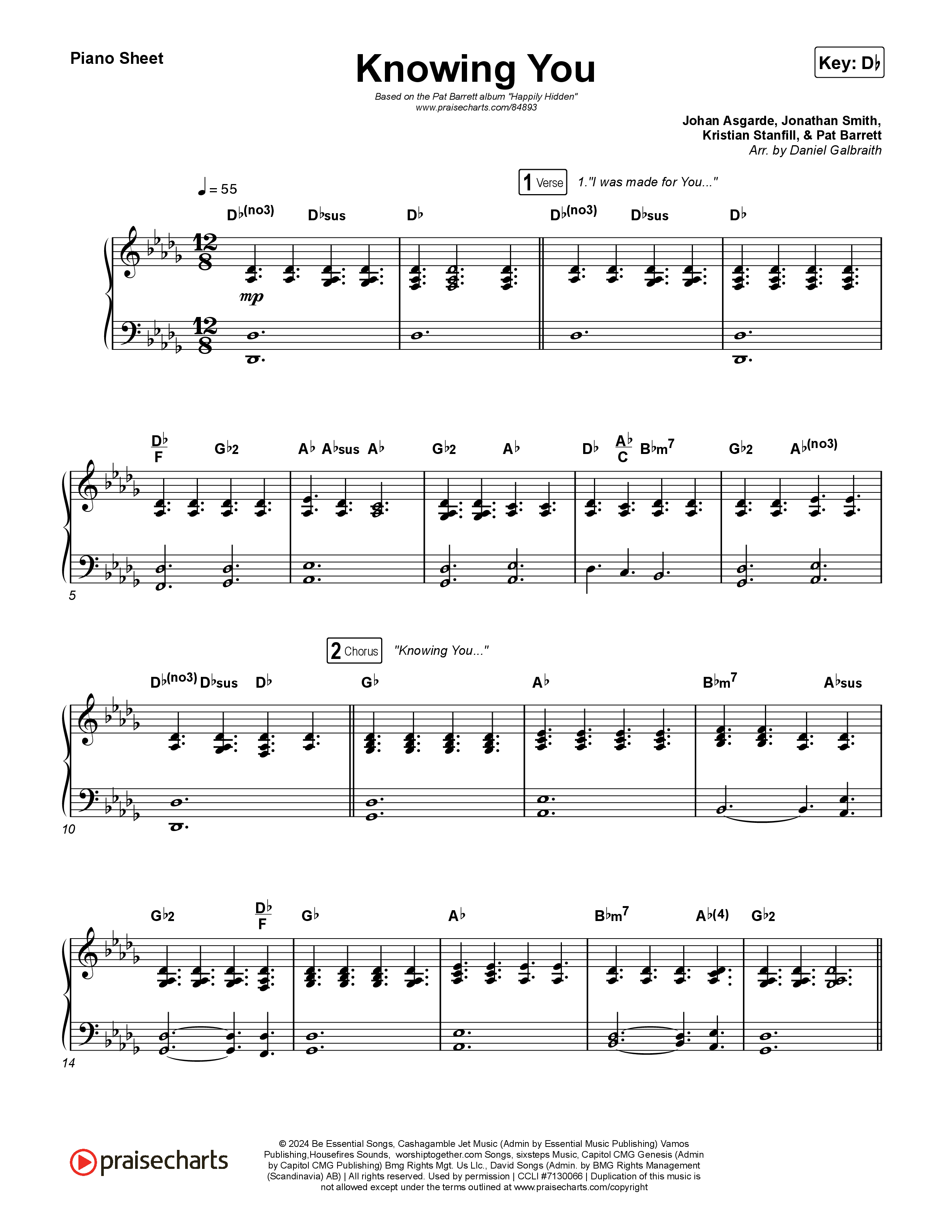 Download the piano sheet for Knowing You by Pat Barrett / Steffany Gretzinger, from the album Happily Hidden. This song was arranged by Daniel Galbraith in the key of C, Db.