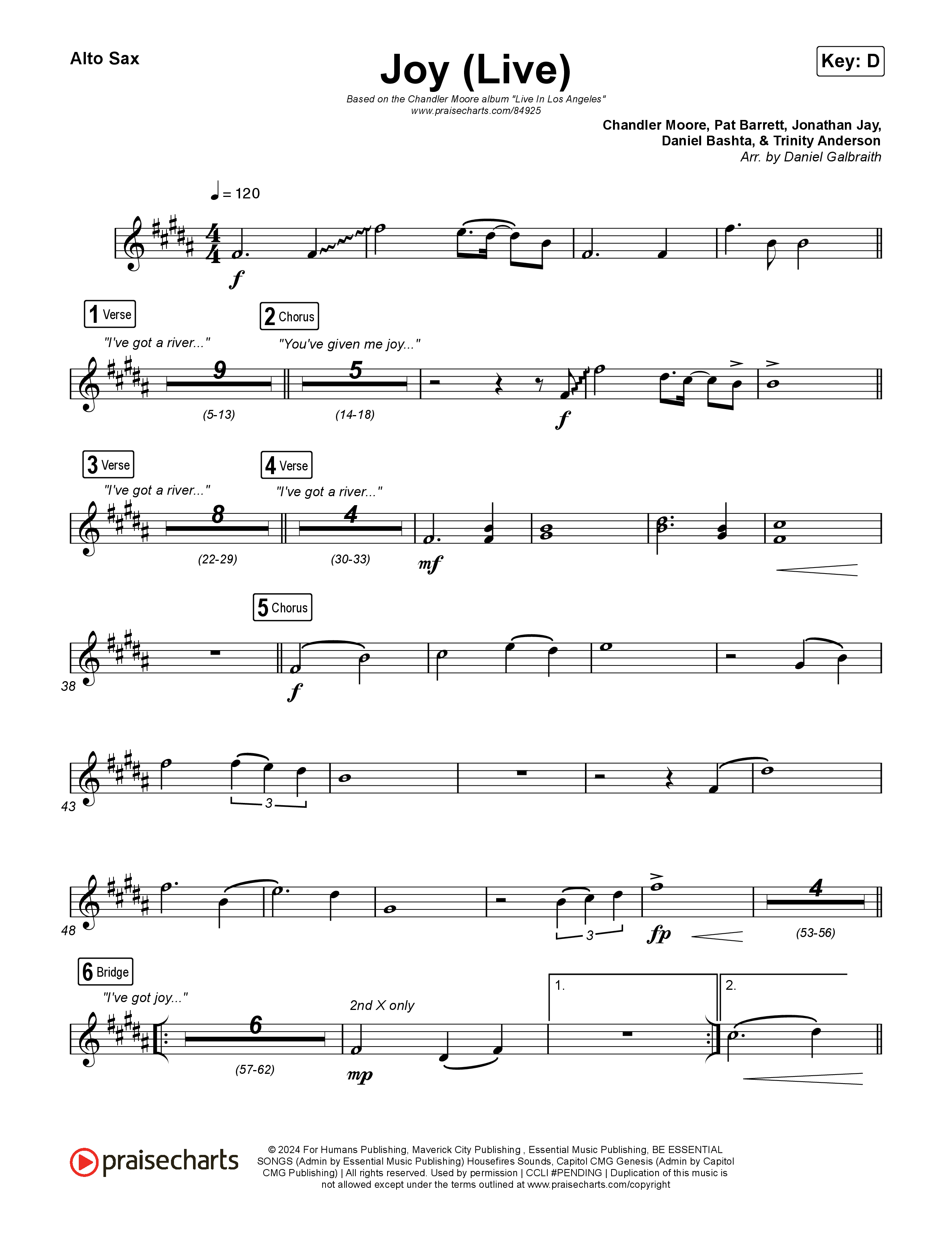 Download the Saxaphone instruments PDF sheet music for Joy (Live) by Chandler Moore / Israel Houghton, from the album Chandler Moore: Live in Los Angeles. This song was arranged by Daniel Galbraith in the key of C, D.