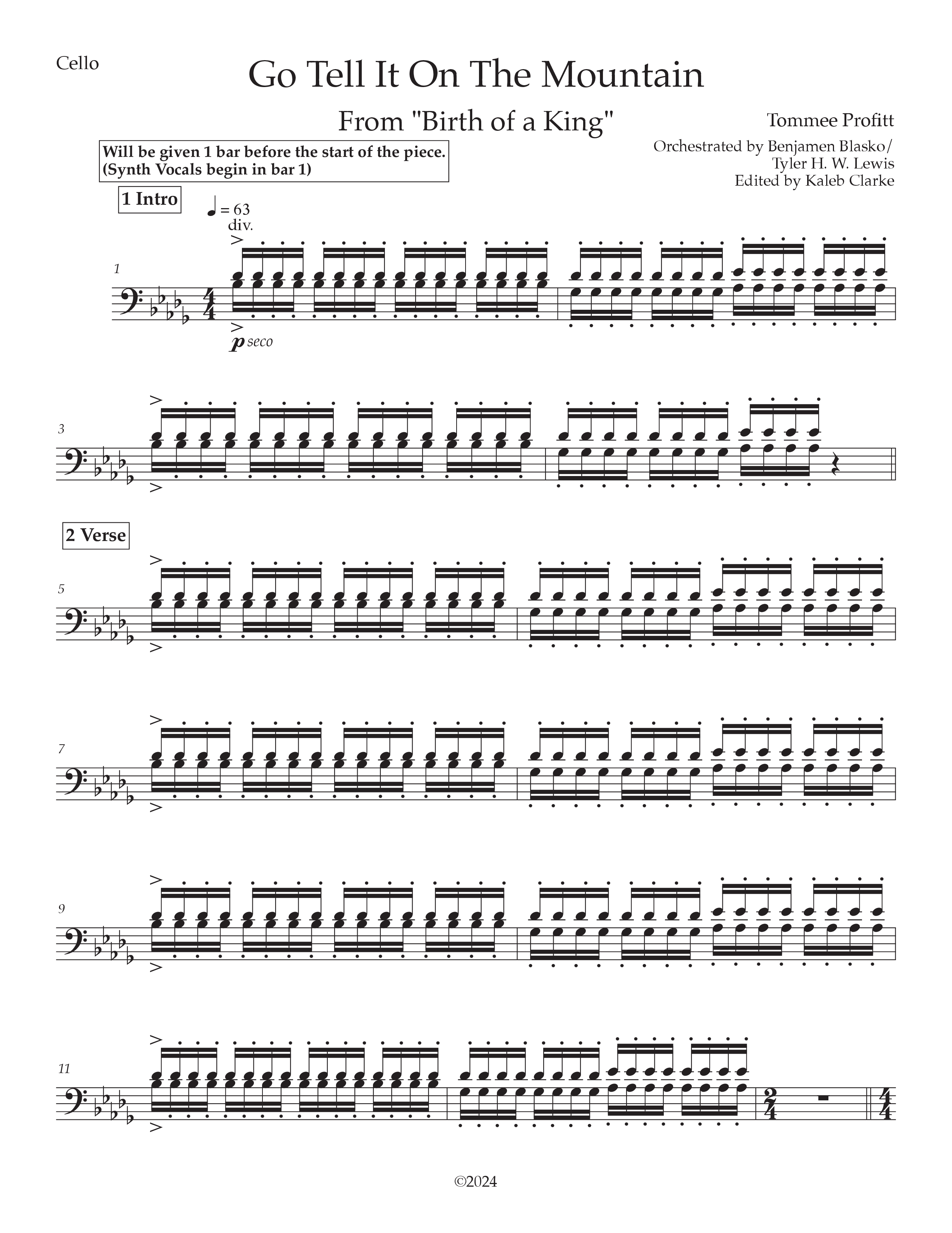 Download the Cello sheet music for Go Tell It On The Mountain (Live) by Tommee Profitt / Crowder, from the album The Birth Of A King: Live In Concert. This song was arranged by Benjamen Blasko / Tyler H. W. Lewis in the key of Db.