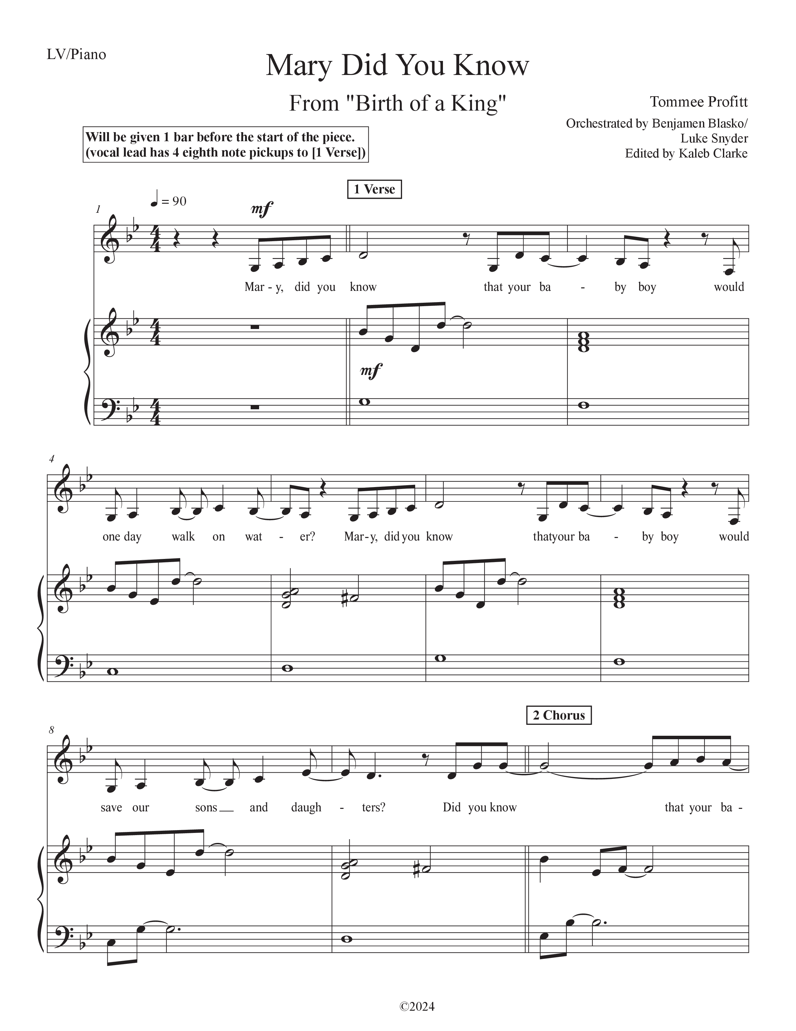Download the sheet music for Mary Did You Know (Live) by Tommee Profitt / Jordan Smith, from the album The Birth Of A King: Live In Concert. This song was arranged by Benjamen Blasko / Luke Snyder in the key of Bb.