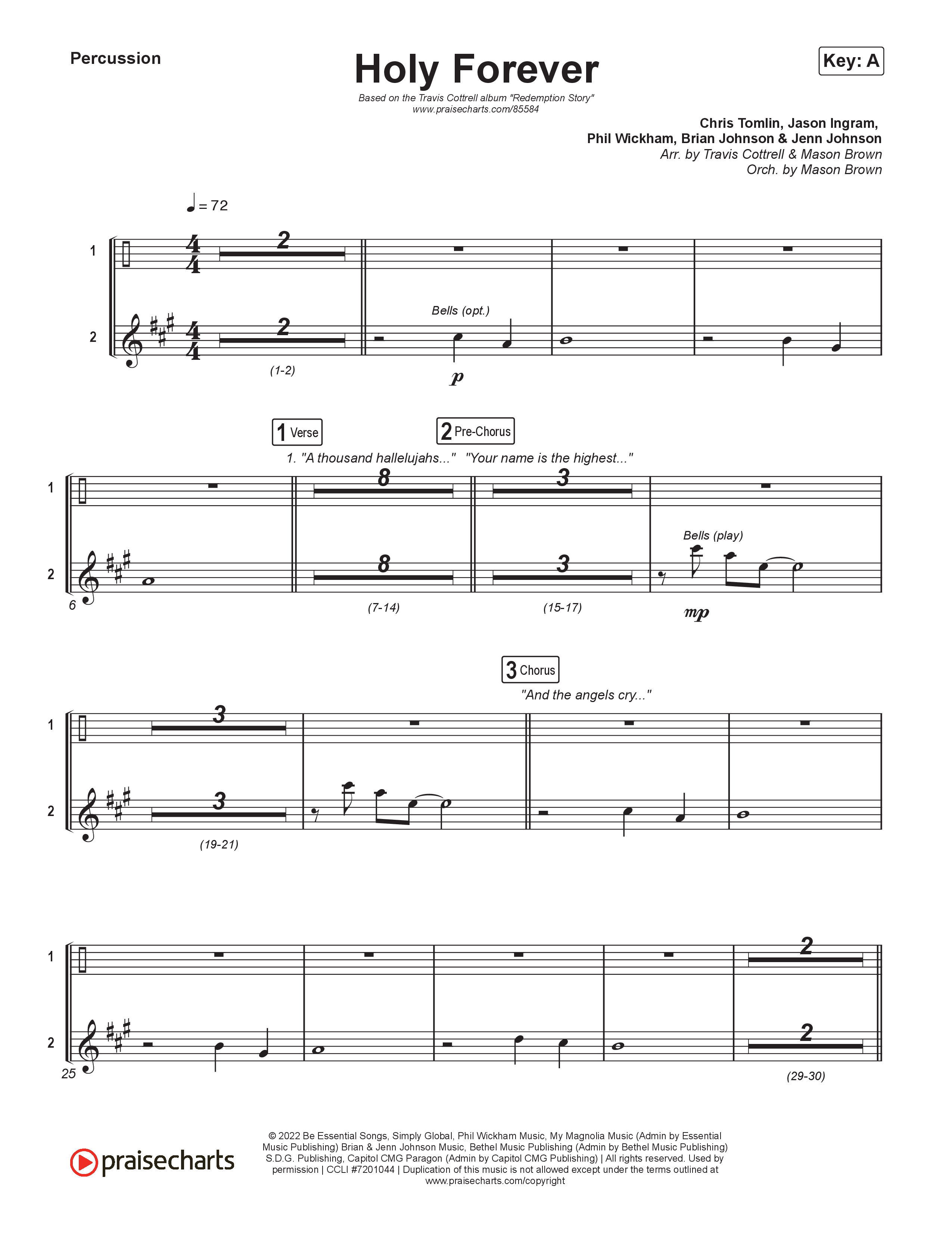 Download the percussion sheet music for Holy Forever (Choral/SATB) by Travis Cottrell / Arr. Mason Brown, from the album Redemption Story. This song was arranged by Travis Cottrell / Mason Brown in the key of A.