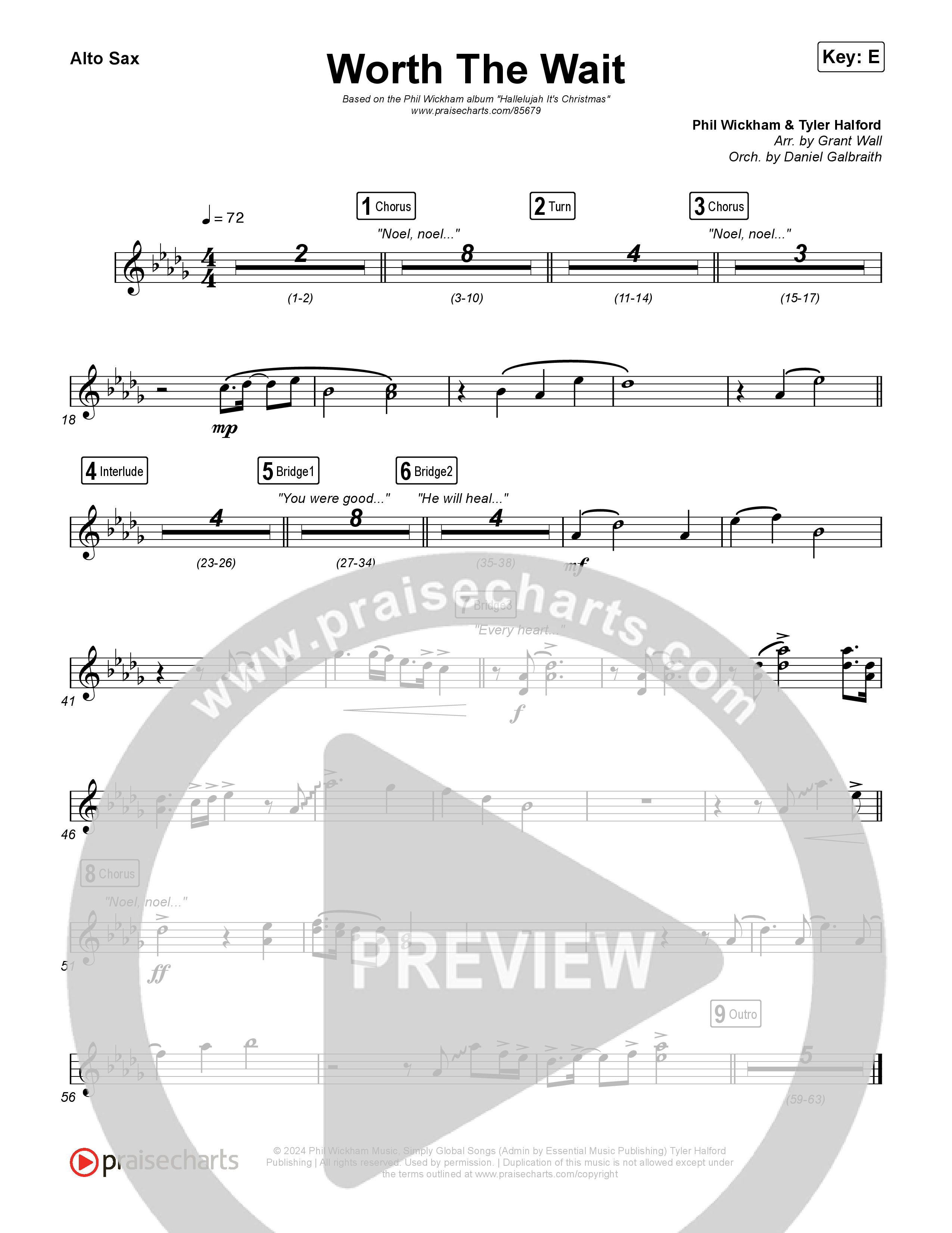 Download the AltoSax sheet music for Worth The Wait by Phil Wickham, from the album Hallelujah! It's Christmas!. This song was arranged by Grant Wall / Daniel Galbraith in the key of D, E.