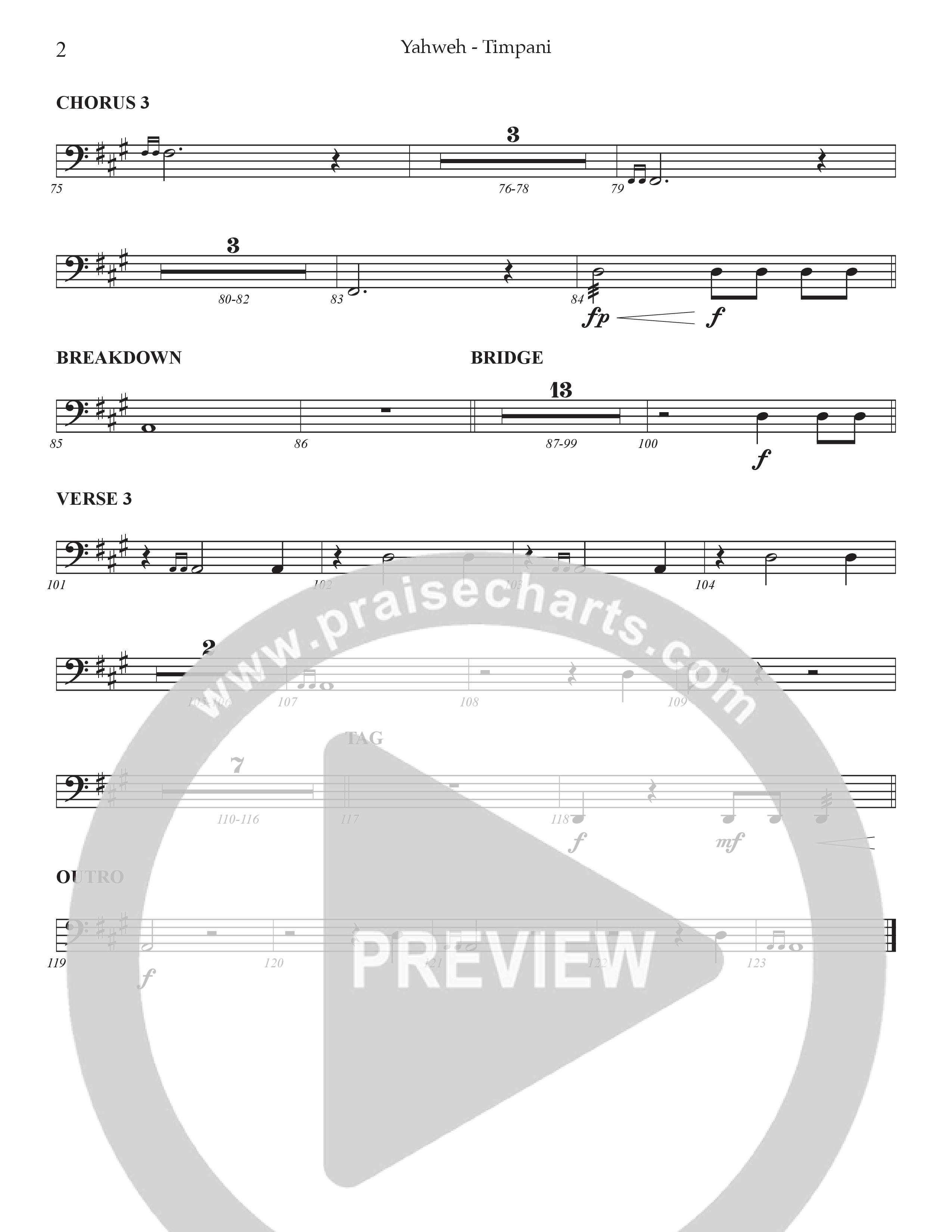 Download the Timpani sheet music for Yahweh by Prestonwood Worship / Arr. Dylan McNab / Orch. Johann Acuna, from the album In This Room. This song was arranged by Dylan McNab / Johann Acuna in the key of A.