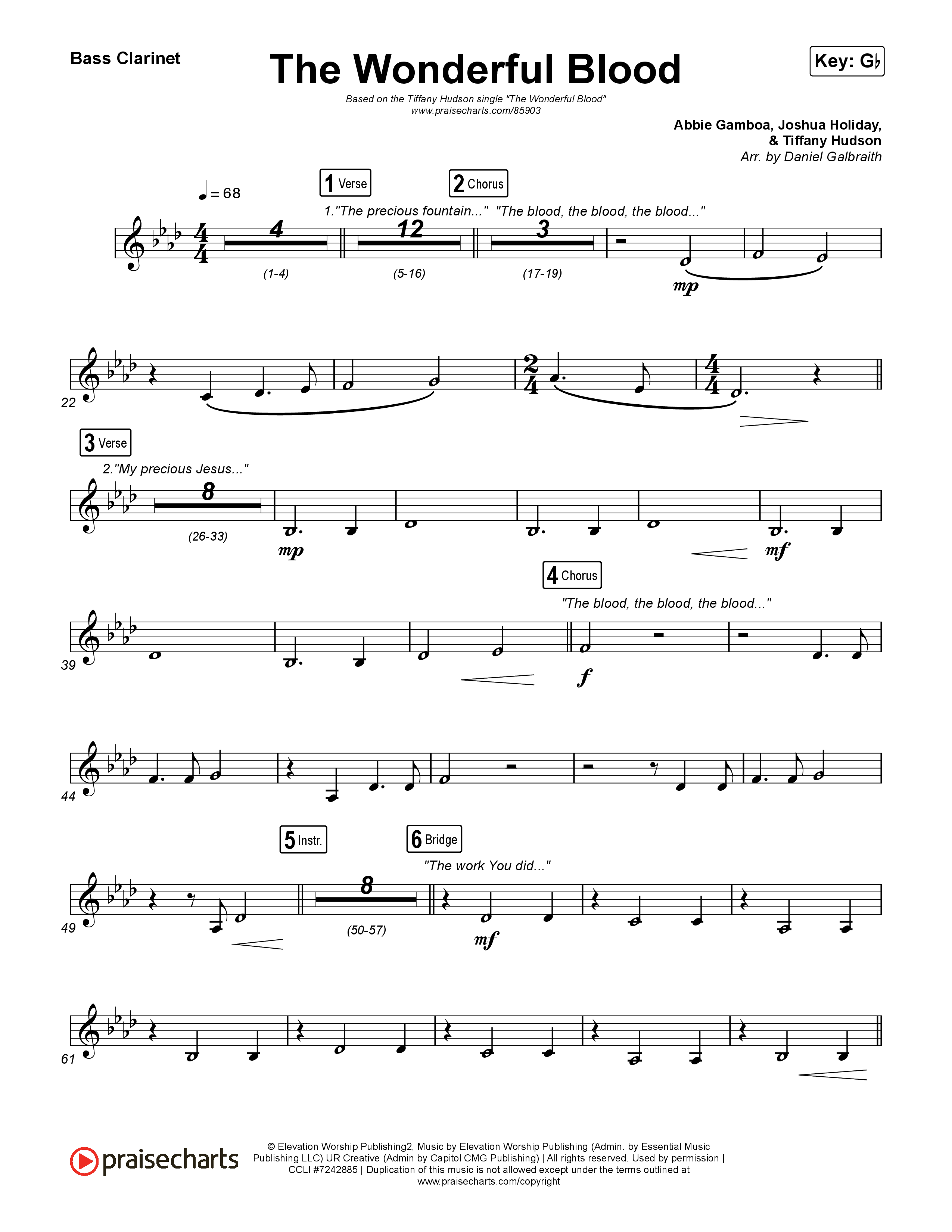 Download the Bass Clarinet sheet music for The Wonderful Blood by Tiffany Hudson, from the album The Wonderful Blood. This song was arranged by Daniel Galbraith in the key of F, Gb.