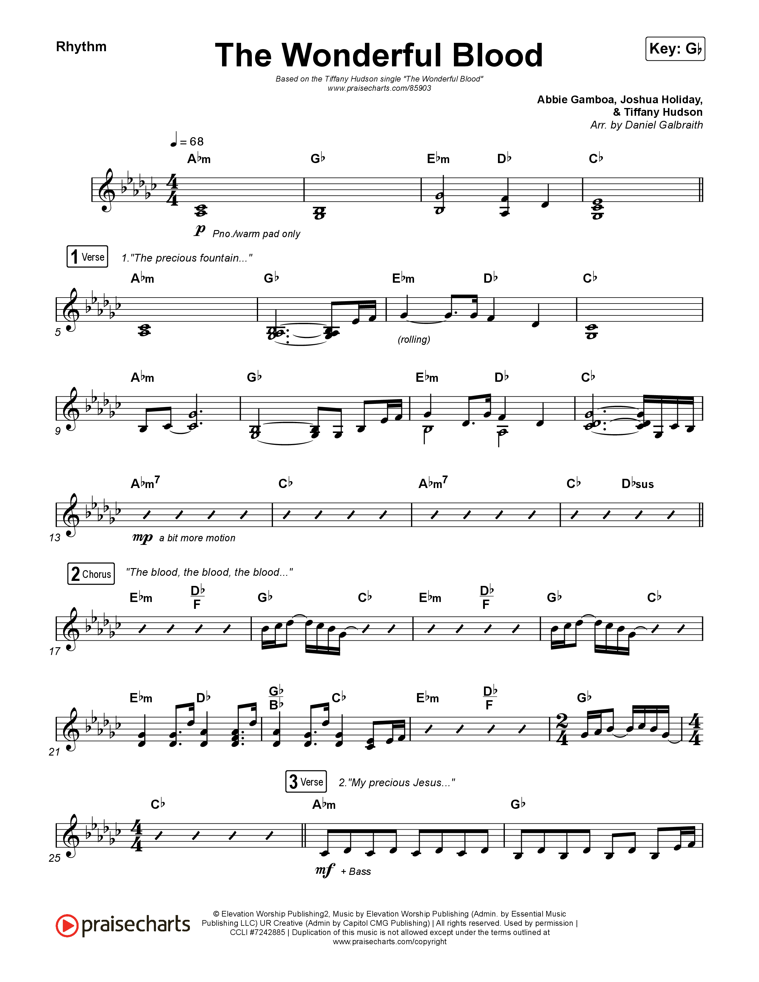 Download the Rhythm Chart for The Wonderful Blood by Tiffany Hudson, from the album The Wonderful Blood. This song was arranged by Daniel Galbraith in the key of F, Gb.
