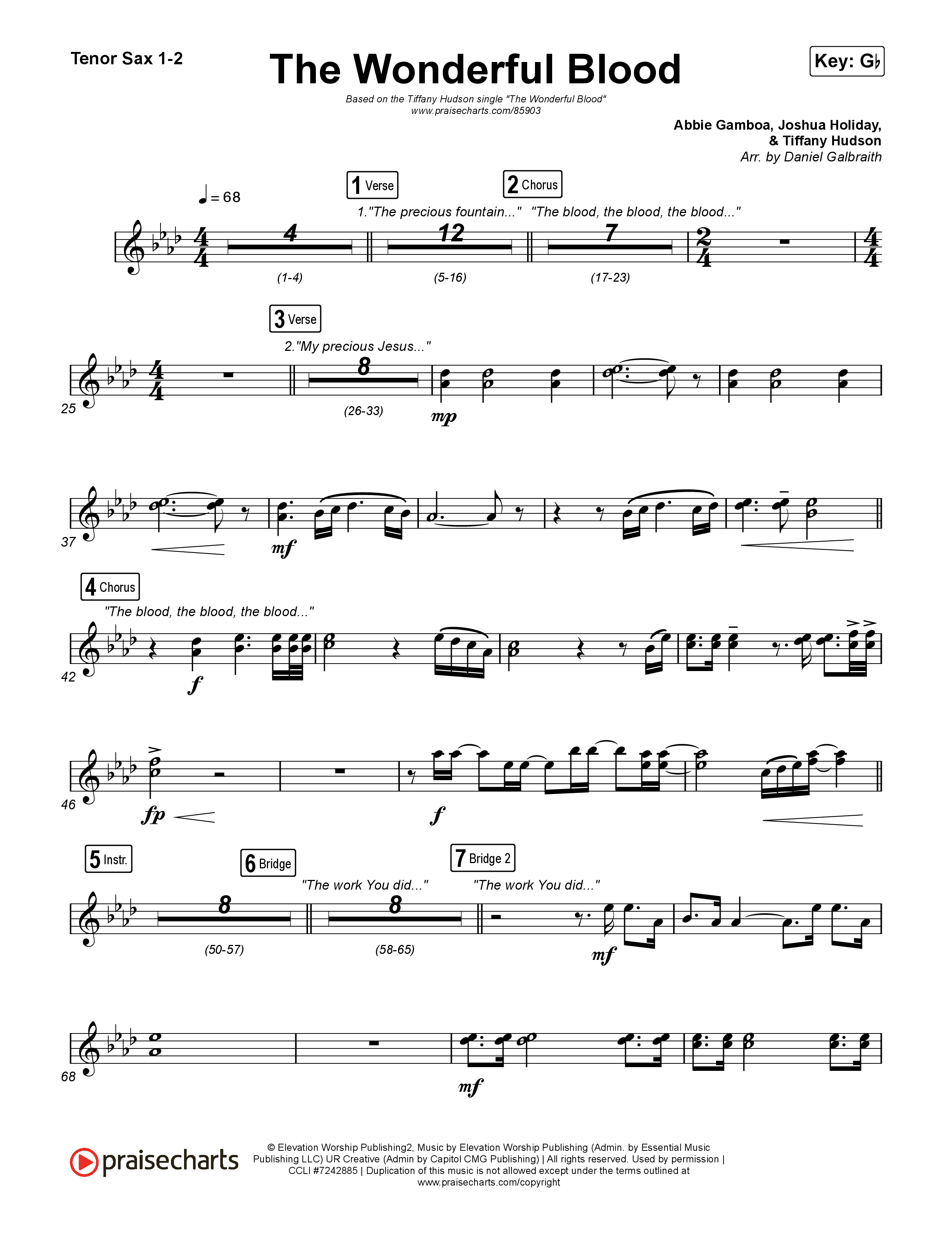 Download the Tenor Sax sheet music for The Wonderful Blood by Tiffany Hudson, from the album The Wonderful Blood. This song was arranged by Daniel Galbraith in the key of F, Gb.