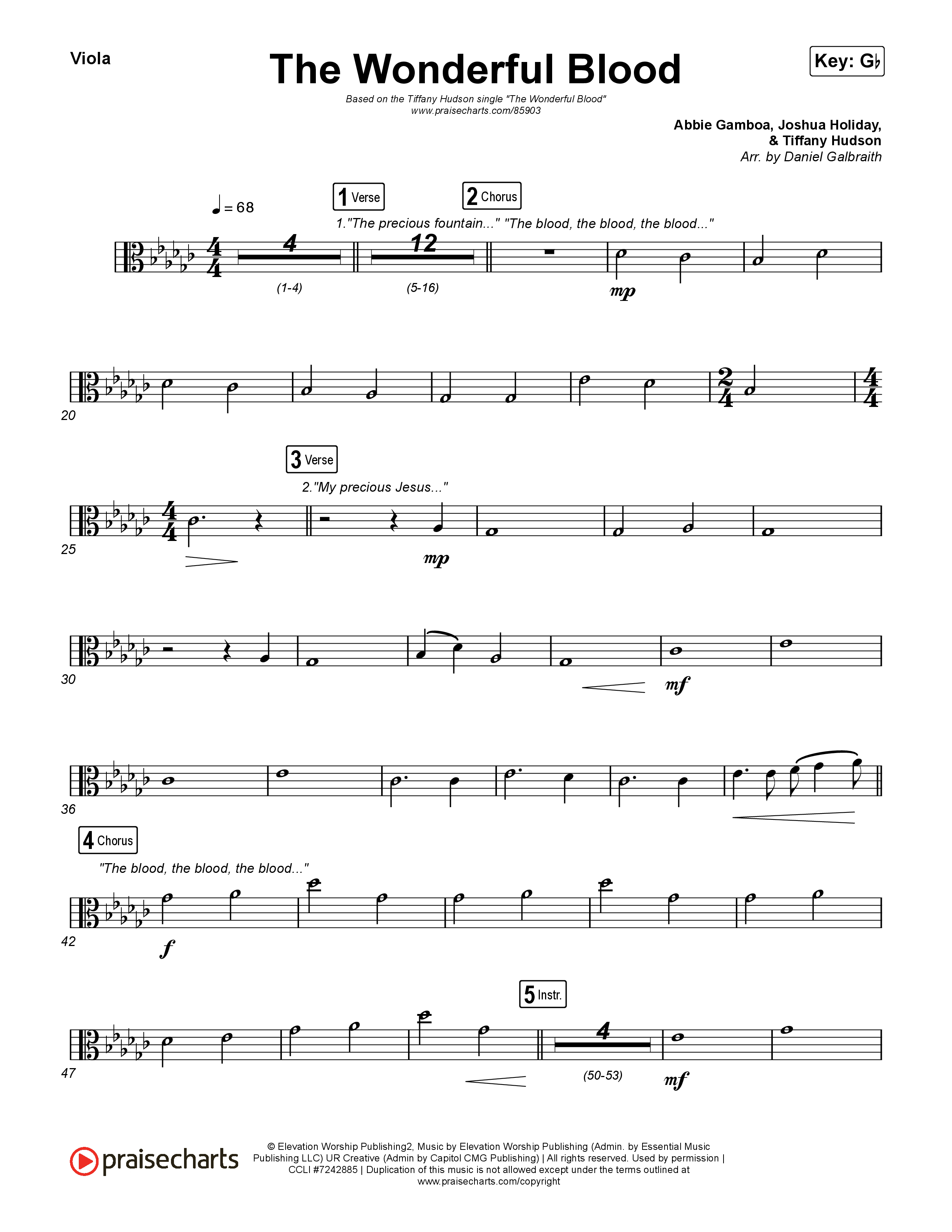 Download the Viola sheet music for The Wonderful Blood by Tiffany Hudson, from the album The Wonderful Blood. This song was arranged by Daniel Galbraith in the key of F, Gb.