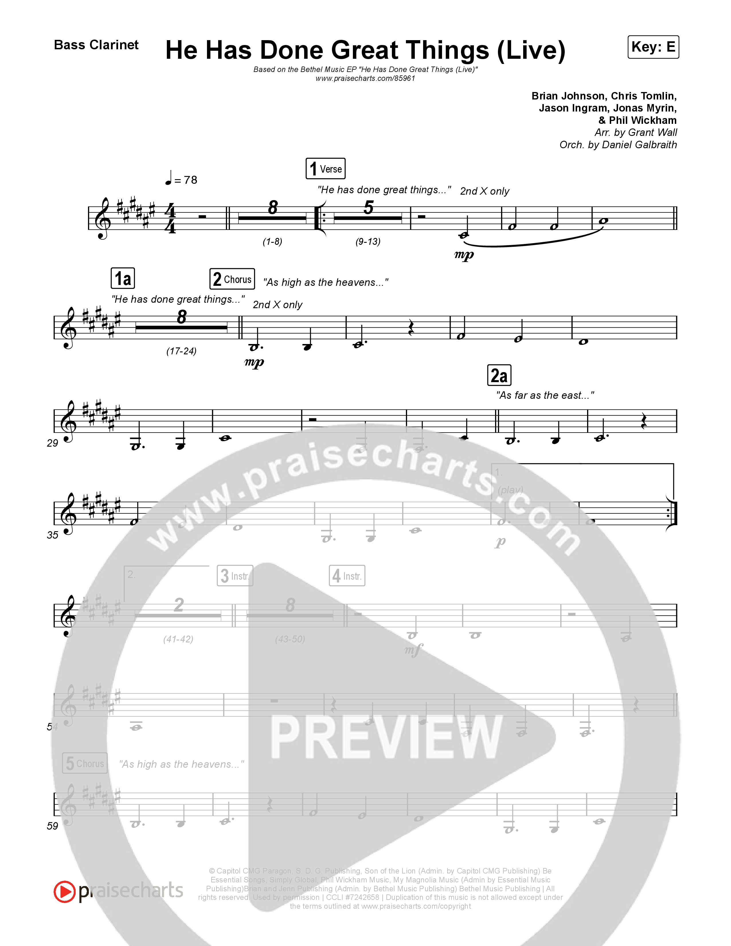 Download the Clarinet sheet music for He Has Done Great Things (Live) by Bethel Music / Brian Johnson, from the album We Must Respond. This song was arranged by Grant Wall / Daniel Galbraith in the key of E, Eb.