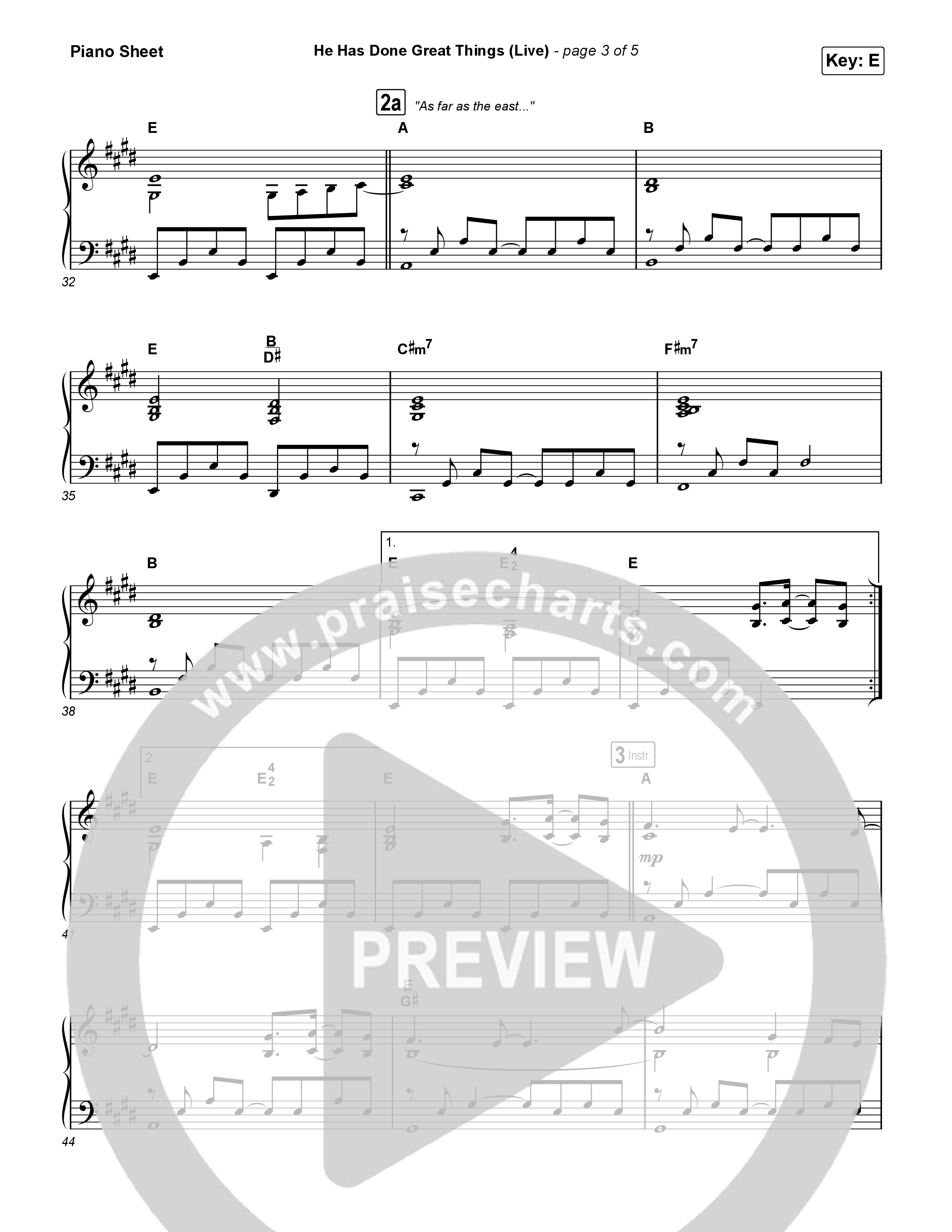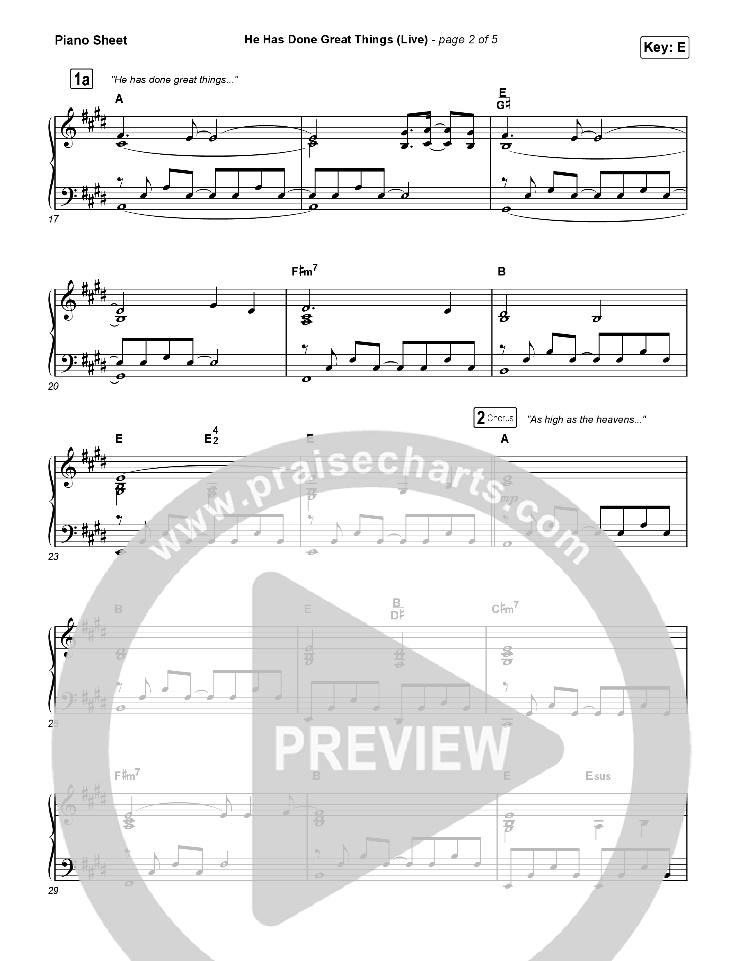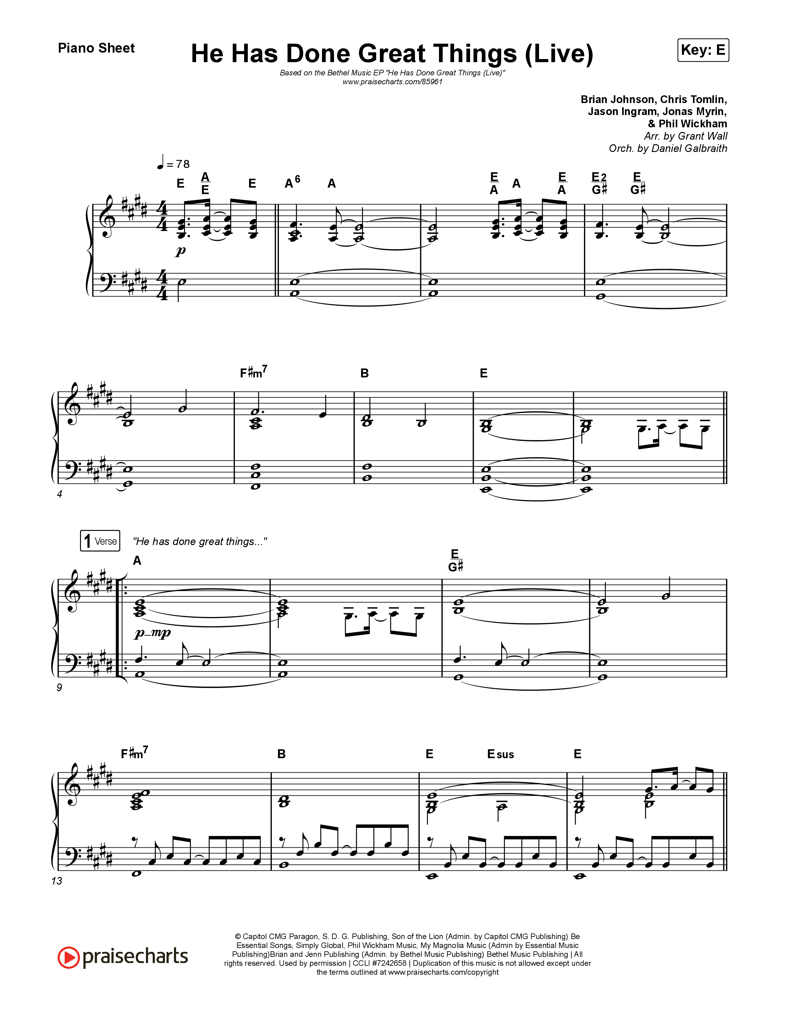 Download the piano sheet for He Has Done Great Things (Live) by Bethel Music / Brian Johnson, from the album We Must Respond. This song was arranged by Grant Wall / Daniel Galbraith in the key of E, Eb.