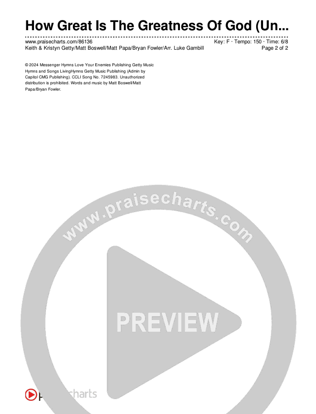Download the PDF Chord Charts for How Great Is The Greatness Of God (Unison/2-Part) by Keith & Kristyn Getty / Matt Boswell / Matt Papa / Bryan Fowler / Arr. Luke Gambill, from the album How Great Is The Greatness of God. This song was arranged by Grant Wall / Daniel Galbraith / Luke Gambill in the key of F.