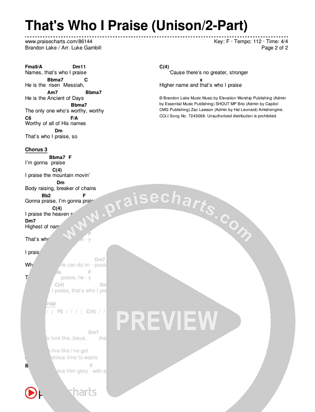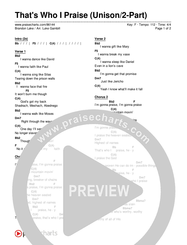 Download the PDF Chord Charts for That's Who I Praise (Unison/2-Part) by Brandon Lake / Arr. Luke Gambill, from the album That's Who I Praise. This song was arranged by Luke Gambill / Daniel Galbraith in the key of F.