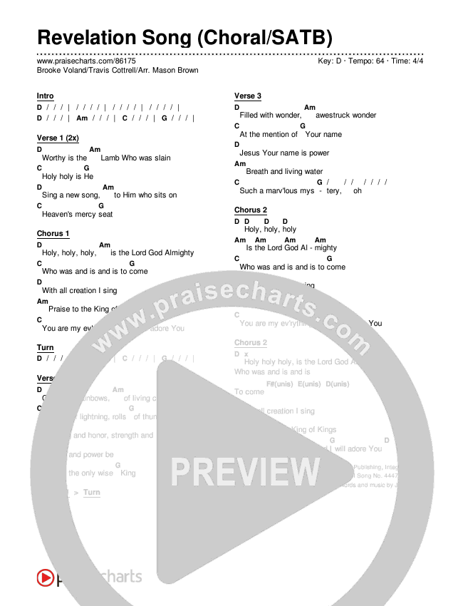 Download the PDF Chord Charts for Revelation Song (Choral/SATB) by Brooke Voland / Travis Cottrell / Arr. Mason Brown, from the album Revelation Song. This song was arranged by Travis Cottrell / Mason Brown in the key of D.