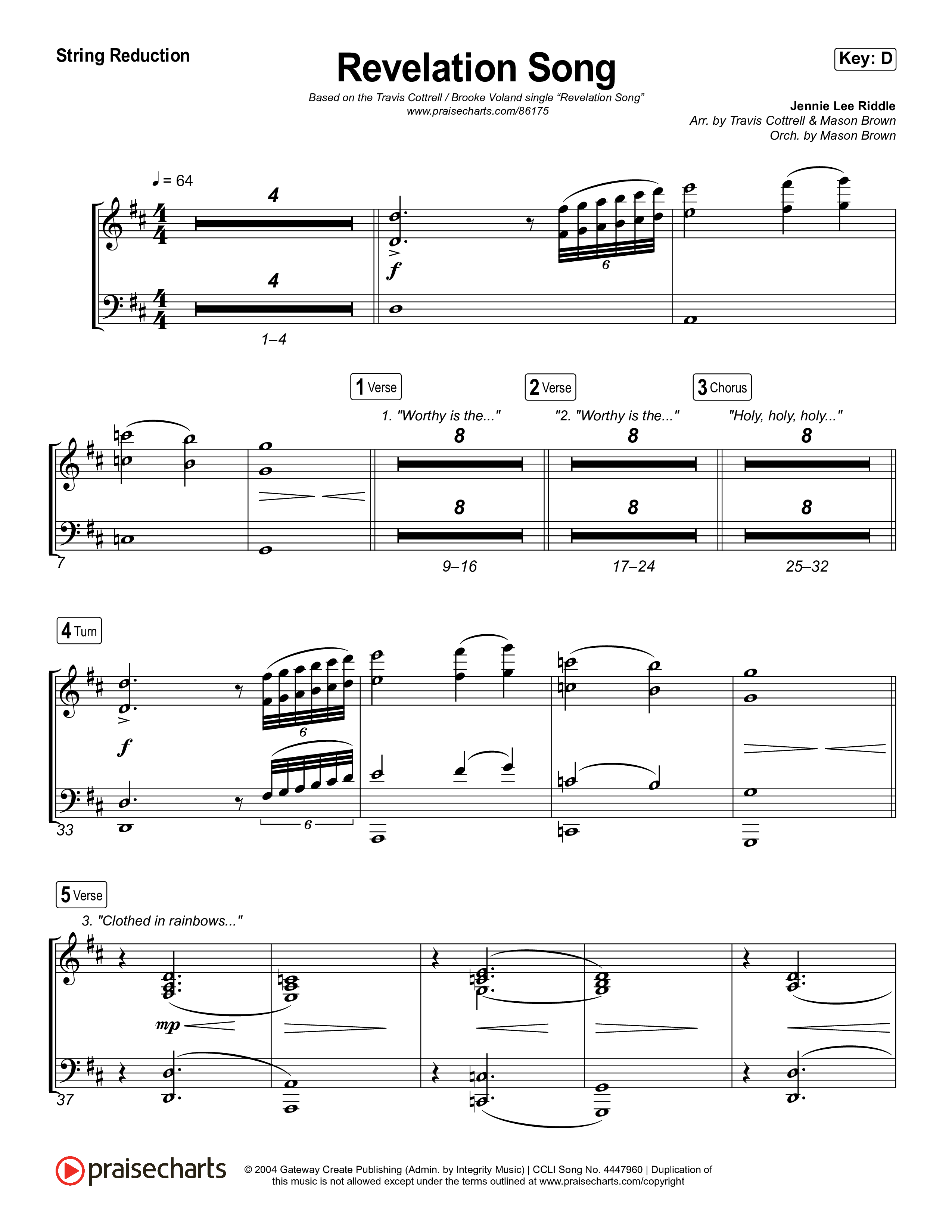 Download the String Reduction sheet music for Revelation Song (Choral/SATB) by Brooke Voland / Travis Cottrell / Arr. Mason Brown, from the album Revelation Song. This song was arranged by Travis Cottrell / Mason Brown in the key of D.