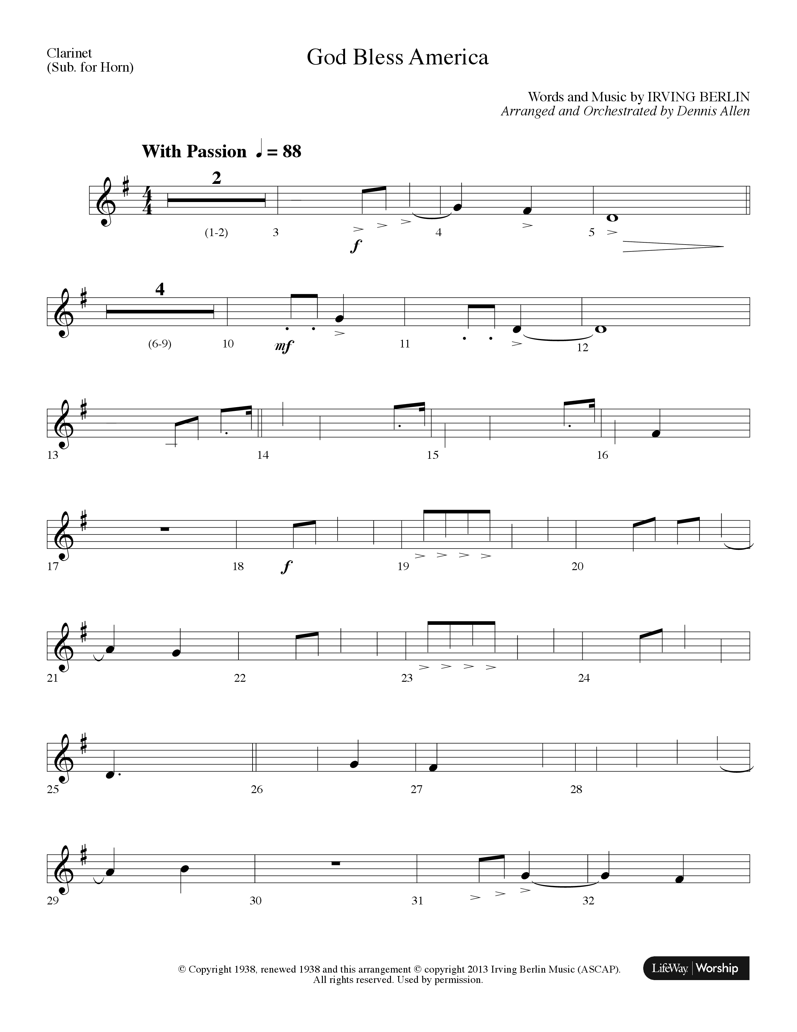 Download the Orchestration for God Bless America (Choral Anthem SATB) by Lifeway Choral / Arr. Dennis Allen, from the album Celebrate America. This song was arranged by Dennis Allen in the key of F.