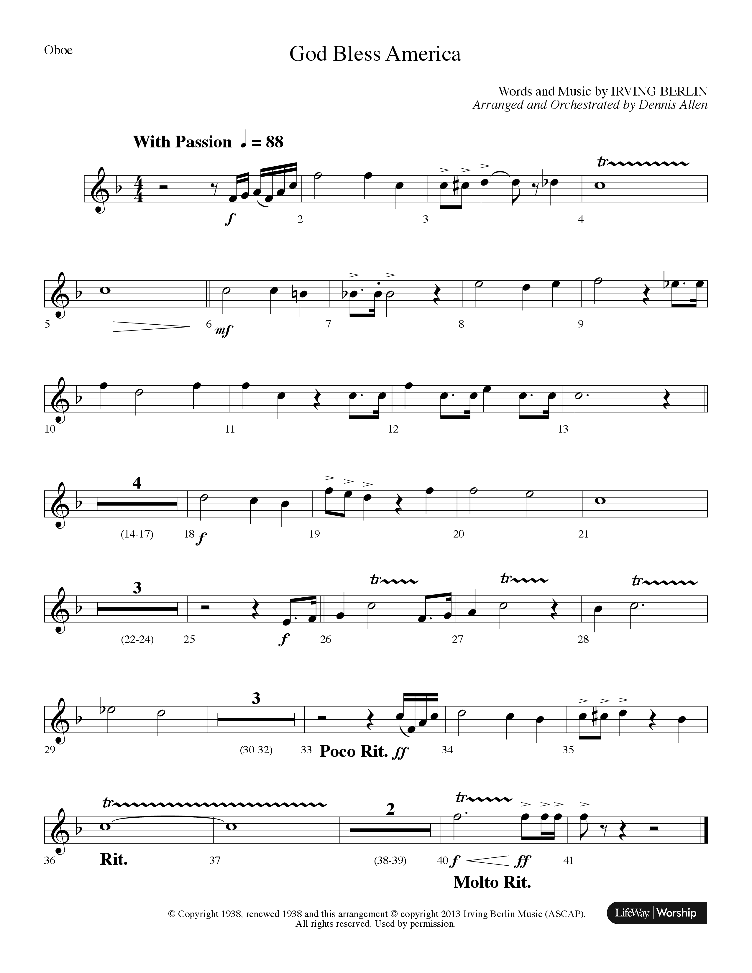 Download the Oboe sheet music for God Bless America (Choral Anthem SATB) by Lifeway Choral / Arr. Dennis Allen, from the album Celebrate America. This song was arranged by Dennis Allen in the key of F.