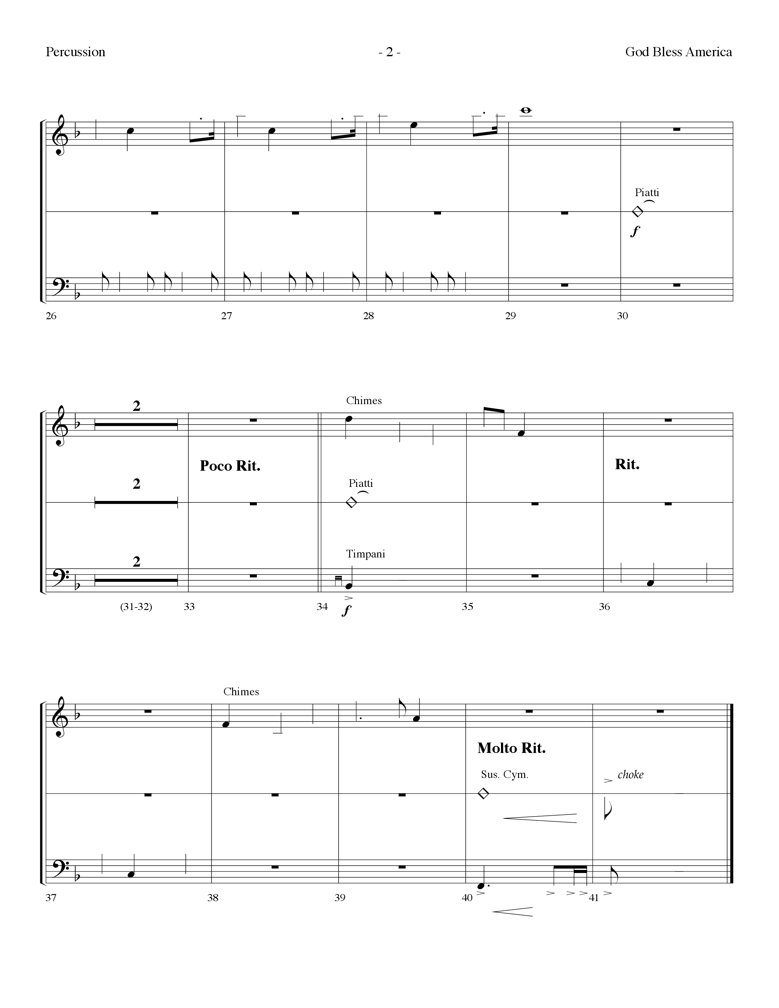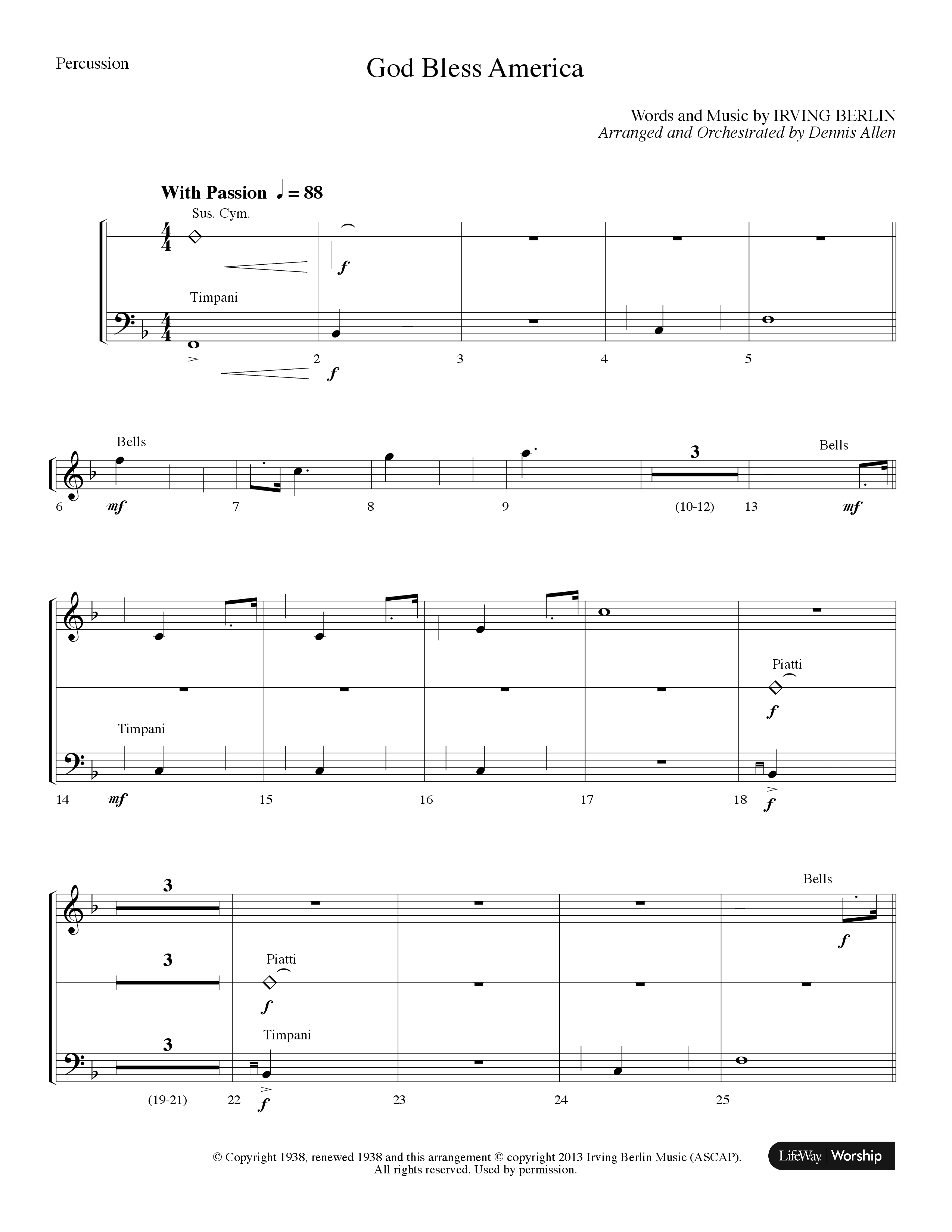 Download the percussion sheet music for God Bless America (Choral Anthem SATB) by Lifeway Choral / Arr. Dennis Allen, from the album Celebrate America. This song was arranged by Dennis Allen in the key of F.