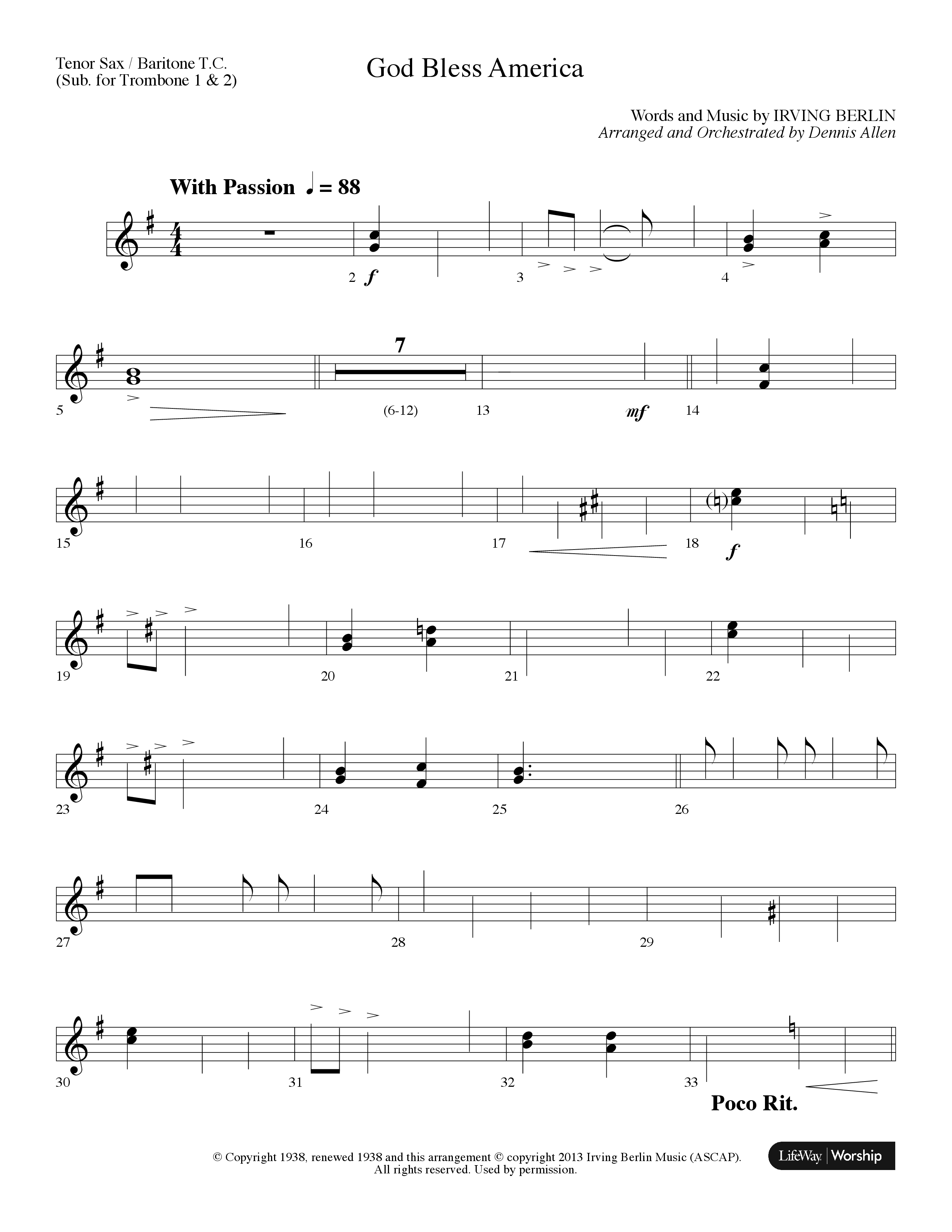 Download the Orchestration for God Bless America (Choral Anthem SATB) by Lifeway Choral / Arr. Dennis Allen, from the album Celebrate America. This song was arranged by Dennis Allen in the key of F.