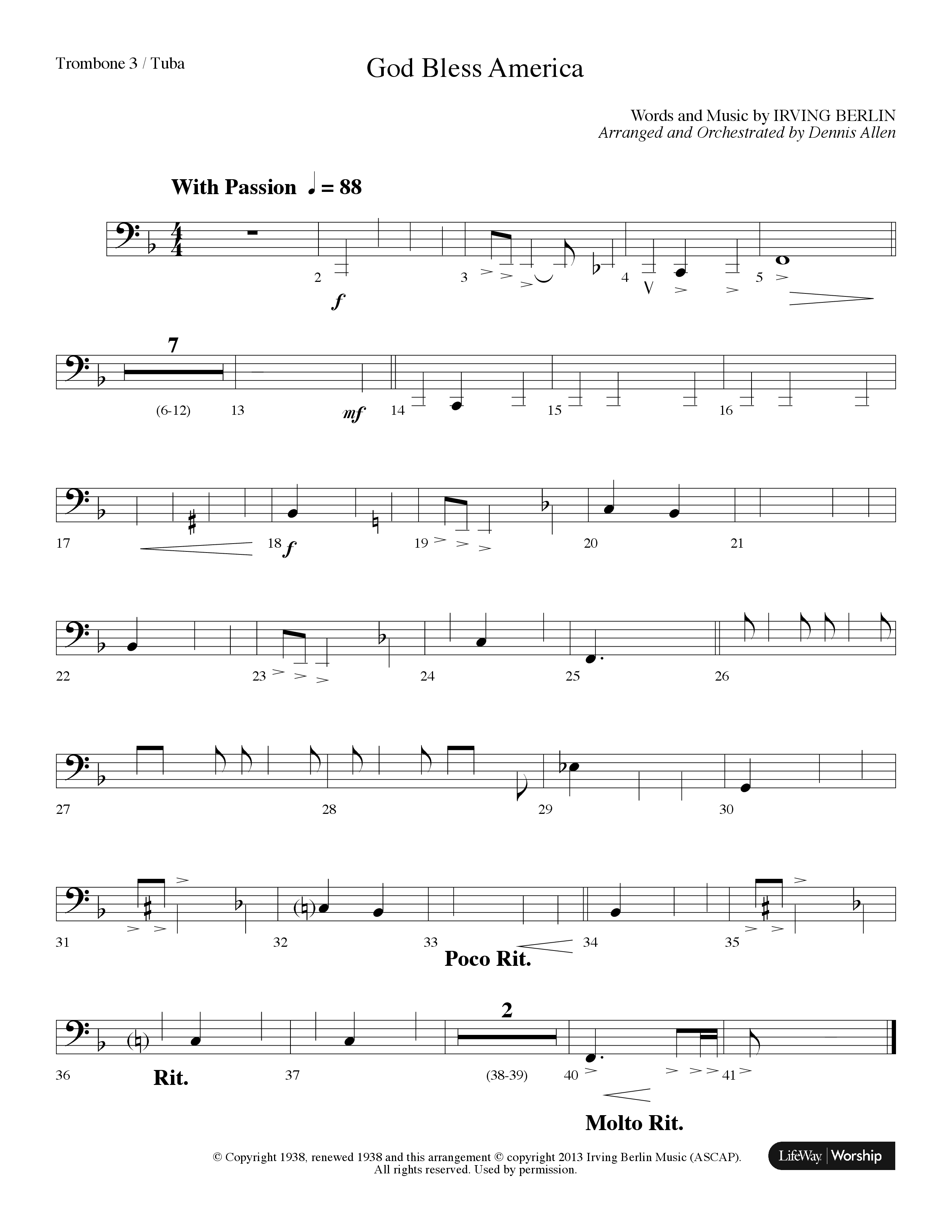 Download the Trombone 3/Tuba sheet music for God Bless America (Choral Anthem SATB) by Lifeway Choral / Arr. Dennis Allen, from the album Celebrate America. This song was arranged by Dennis Allen in the key of F.