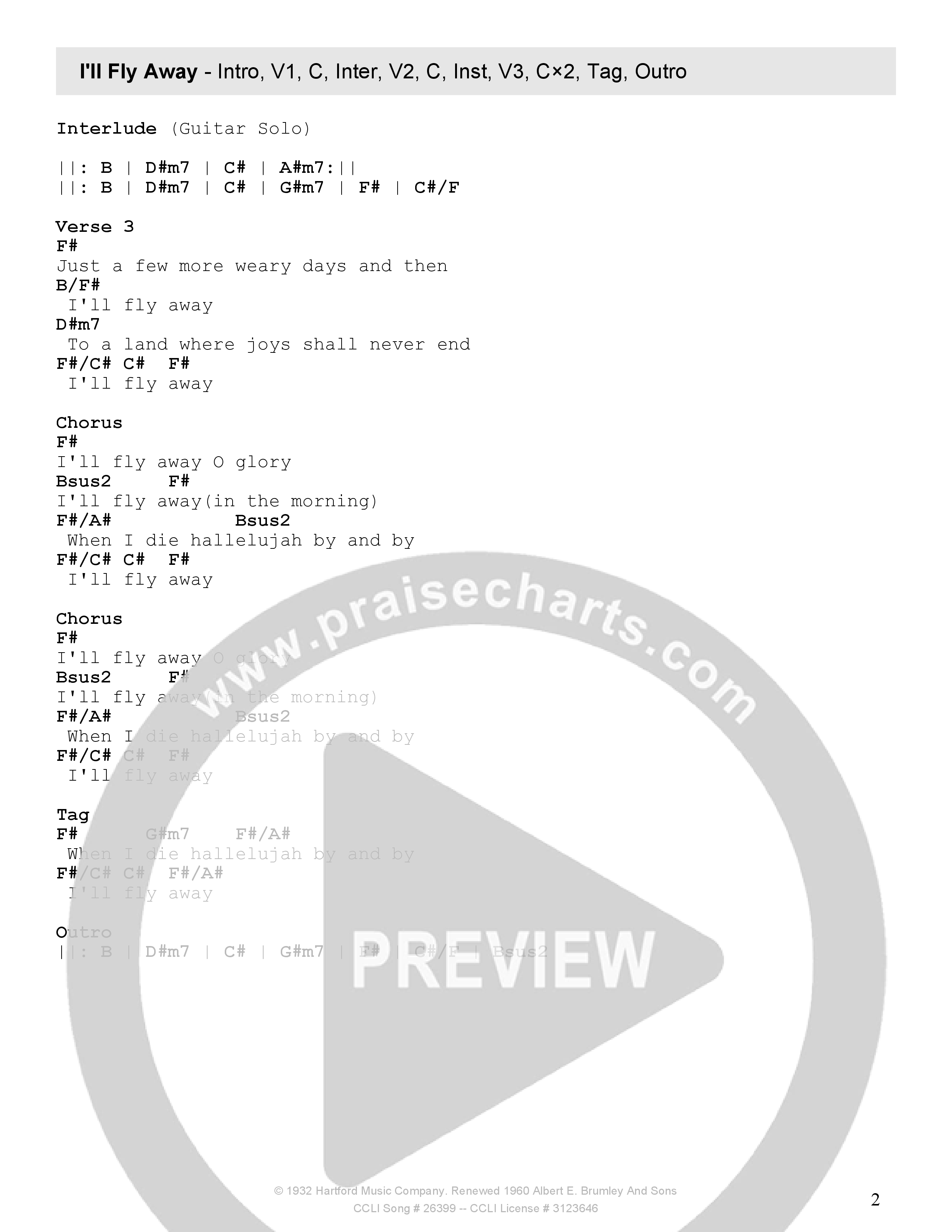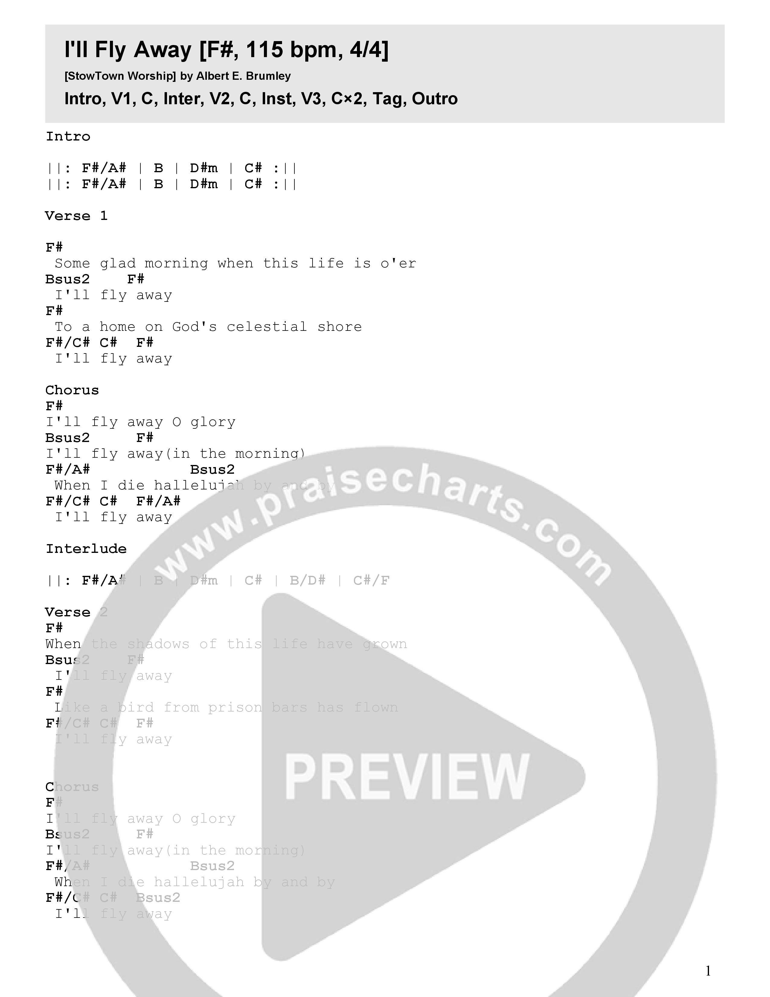 Download the PDF Chord Charts for I'll Fly Away by StowTown Worship / Travis Cottrell / Arr. Matthew Summers / Orch. J. Daniel Smith, from the album StowTown Worship Live From Praisefest Branson Vol 1. This song was arranged by Matthew Summers / J. Daniel Smith in the key of F#.