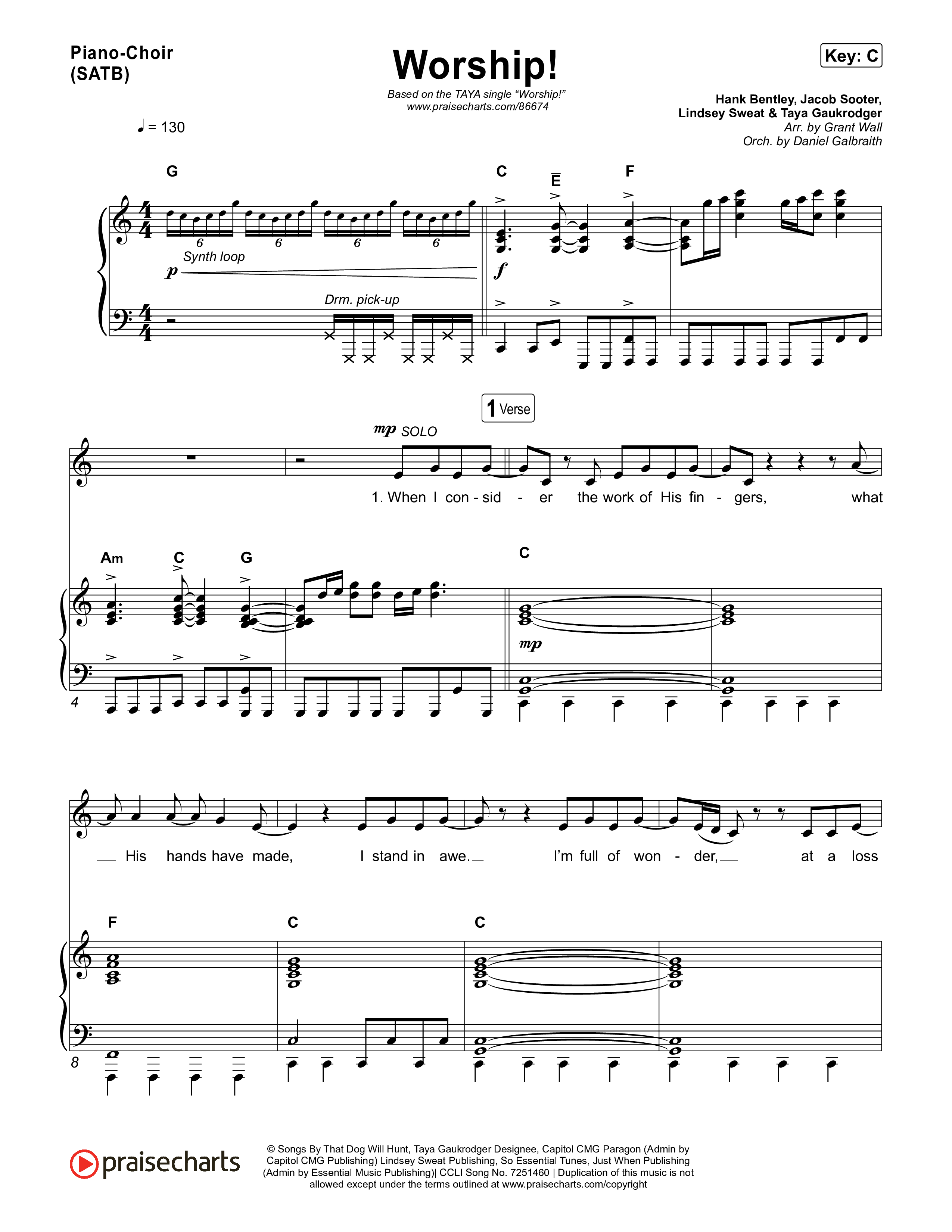Download the PDF sheet music for Worship! by TAYA, from the album The Reminder. This song was arranged by Grant Wall / Daniel Galbraith in the key of Bb, C.