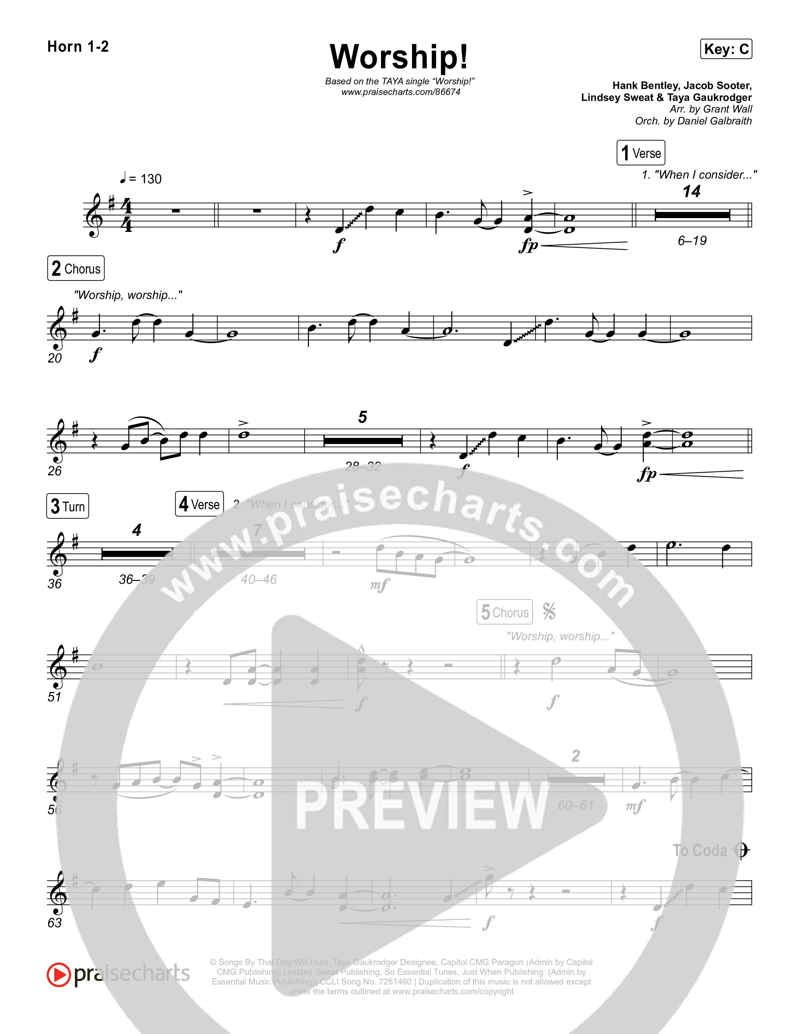 Download the French Horn sheet music for Worship! by TAYA, from the album The Reminder. This song was arranged by Grant Wall / Daniel Galbraith in the key of Bb, C.