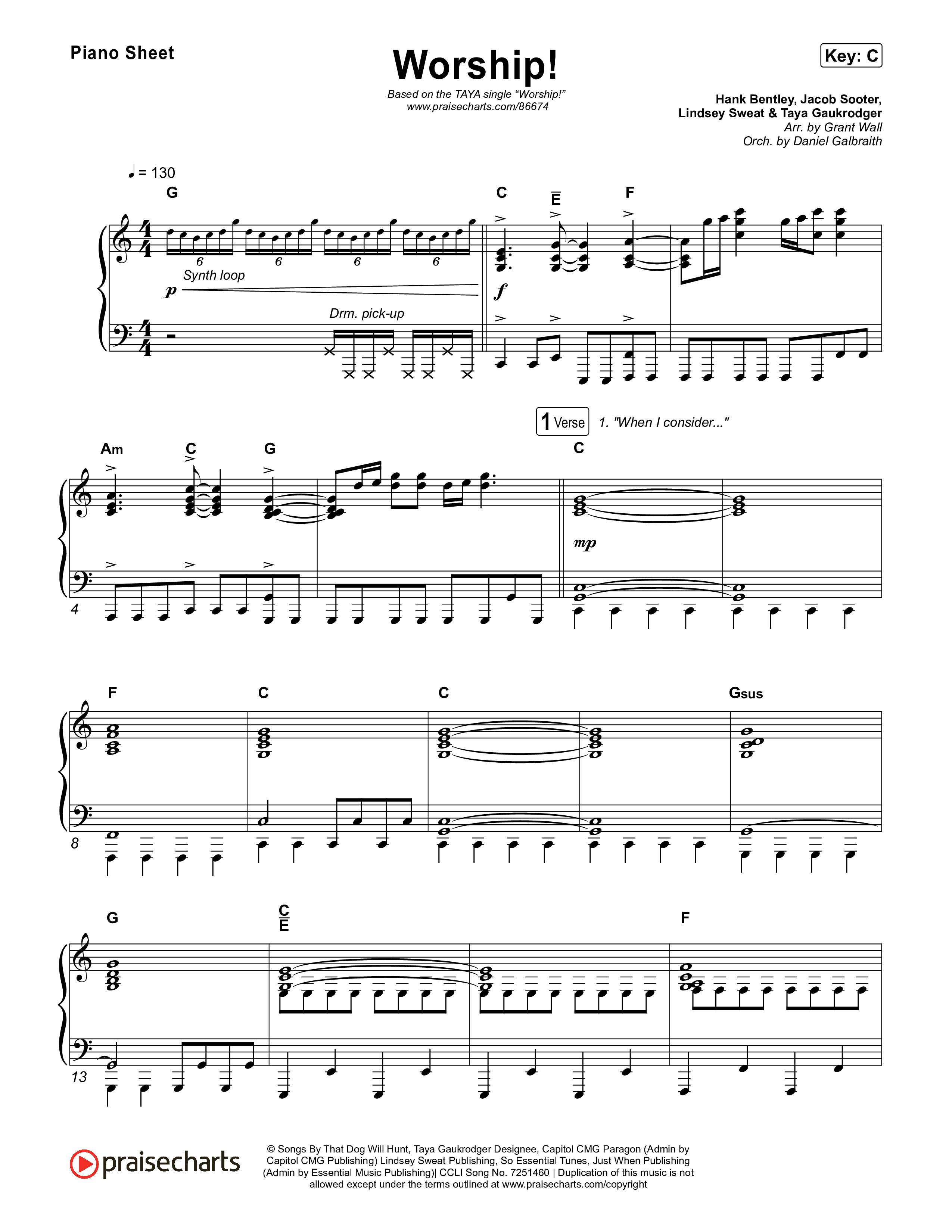 Download the piano sheet for Worship! by TAYA, from the album The Reminder. This song was arranged by Grant Wall / Daniel Galbraith in the key of Bb, C.