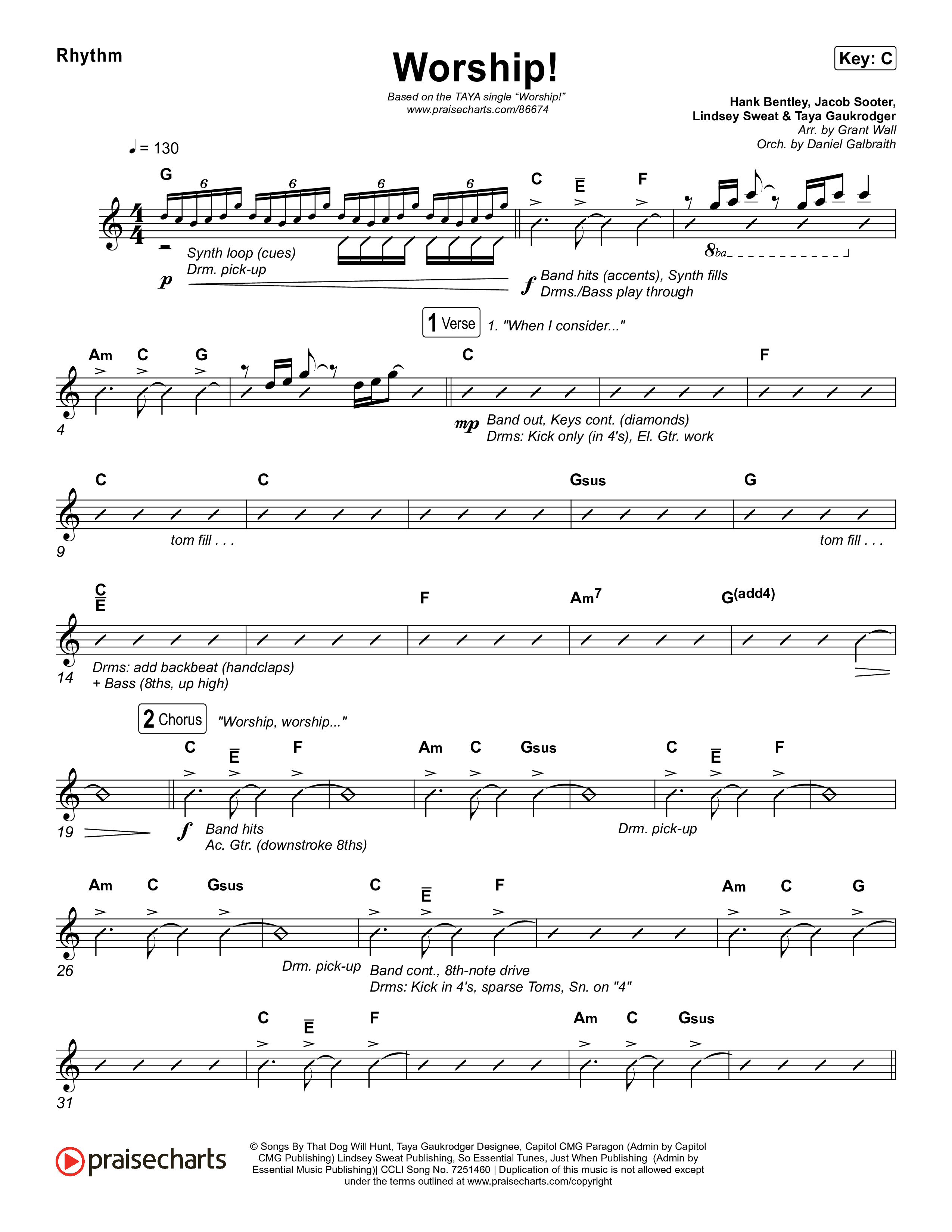 Download the Rhythm Chart for Worship! by TAYA, from the album The Reminder. This song was arranged by Grant Wall / Daniel Galbraith in the key of Bb, C.